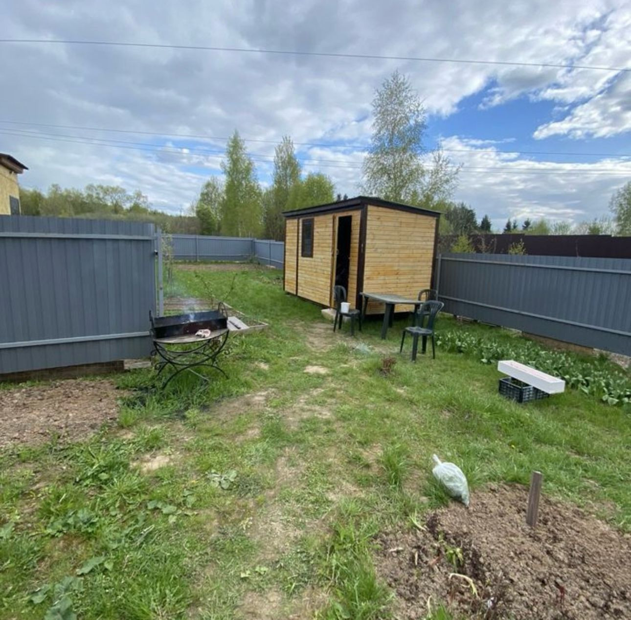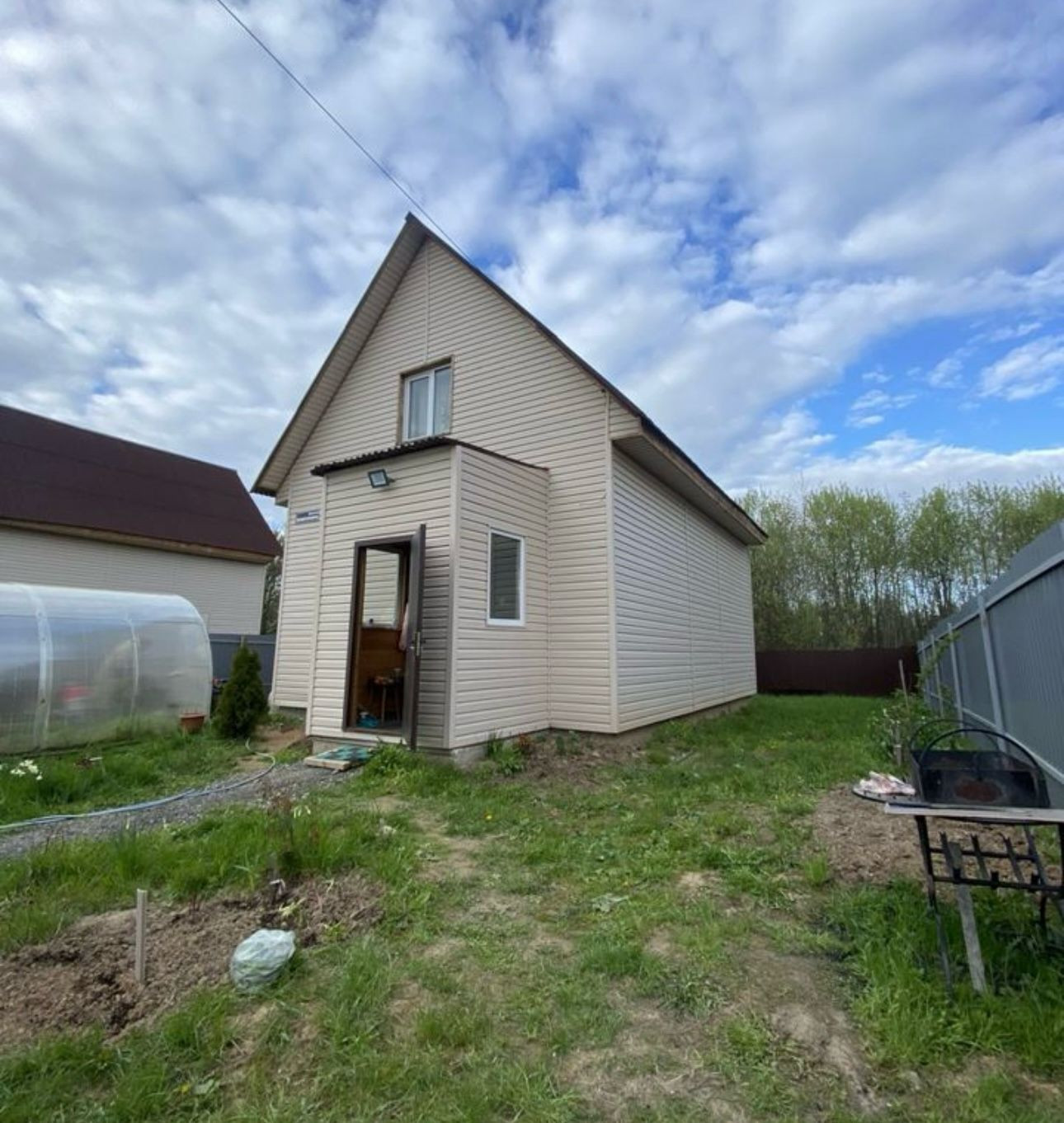 На участке теплица, бытовка для хранения инвентаря.