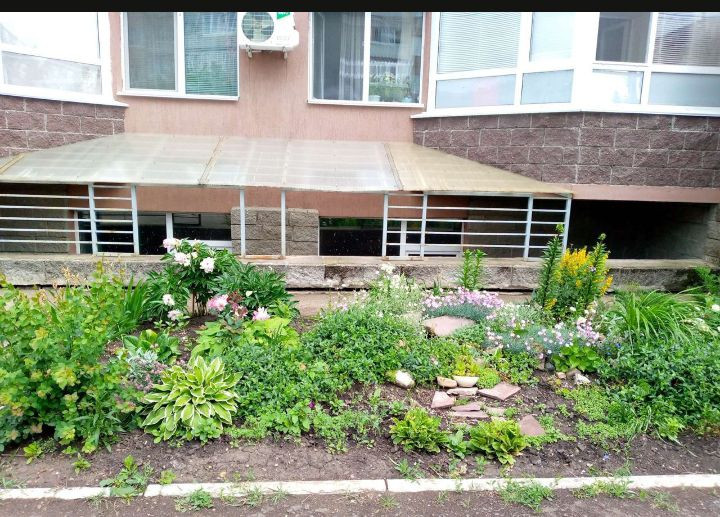 У каждого подъезда разбиты красивые цветущие клумбы