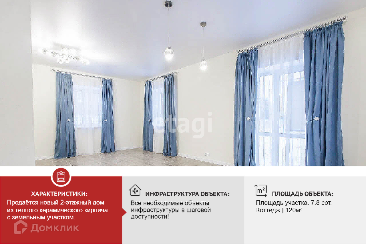 Коттедж продается в полной внутренней дизайнерской отделкой. Общая площадь дома – 120 м2 , жилая – 91 м2, кухня - 19 м2, 4 комнаты. На первом этаже располагаются кухня, гостиная и совмещенный санузел. На втором этаже расположены 3 спальни и еще один санузел. Дом построен из керамического кирпича, облицован снаружи лицевым кирпичом по типу баварская кладка.