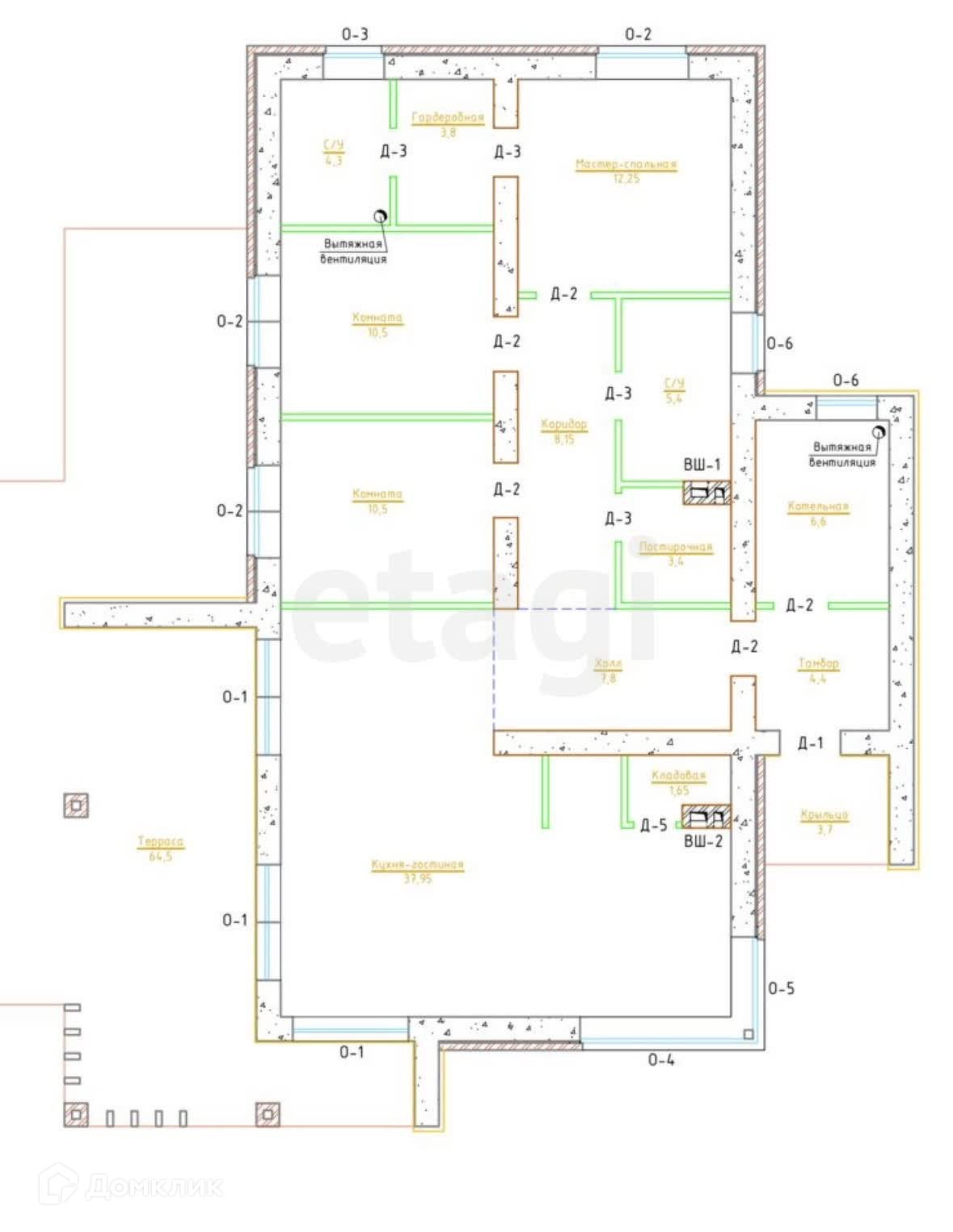 1 этаж – прихожая, 2 сан/узела, холл, гостиная-кухня, котельная, кладовая, 3 спальни.