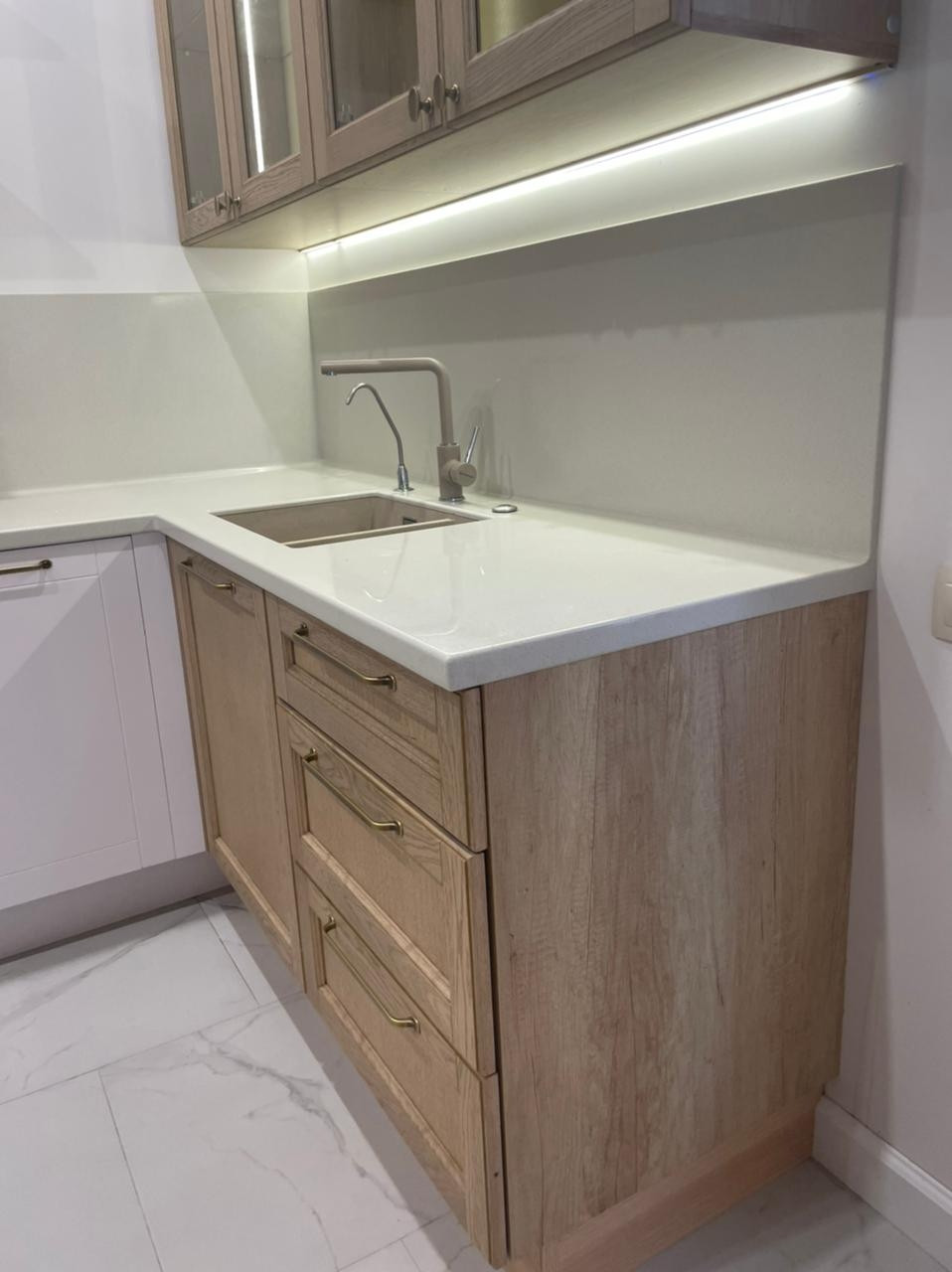 -светлая кухня-гостиная, с дизайнерской кухней и системами хранения до потолка