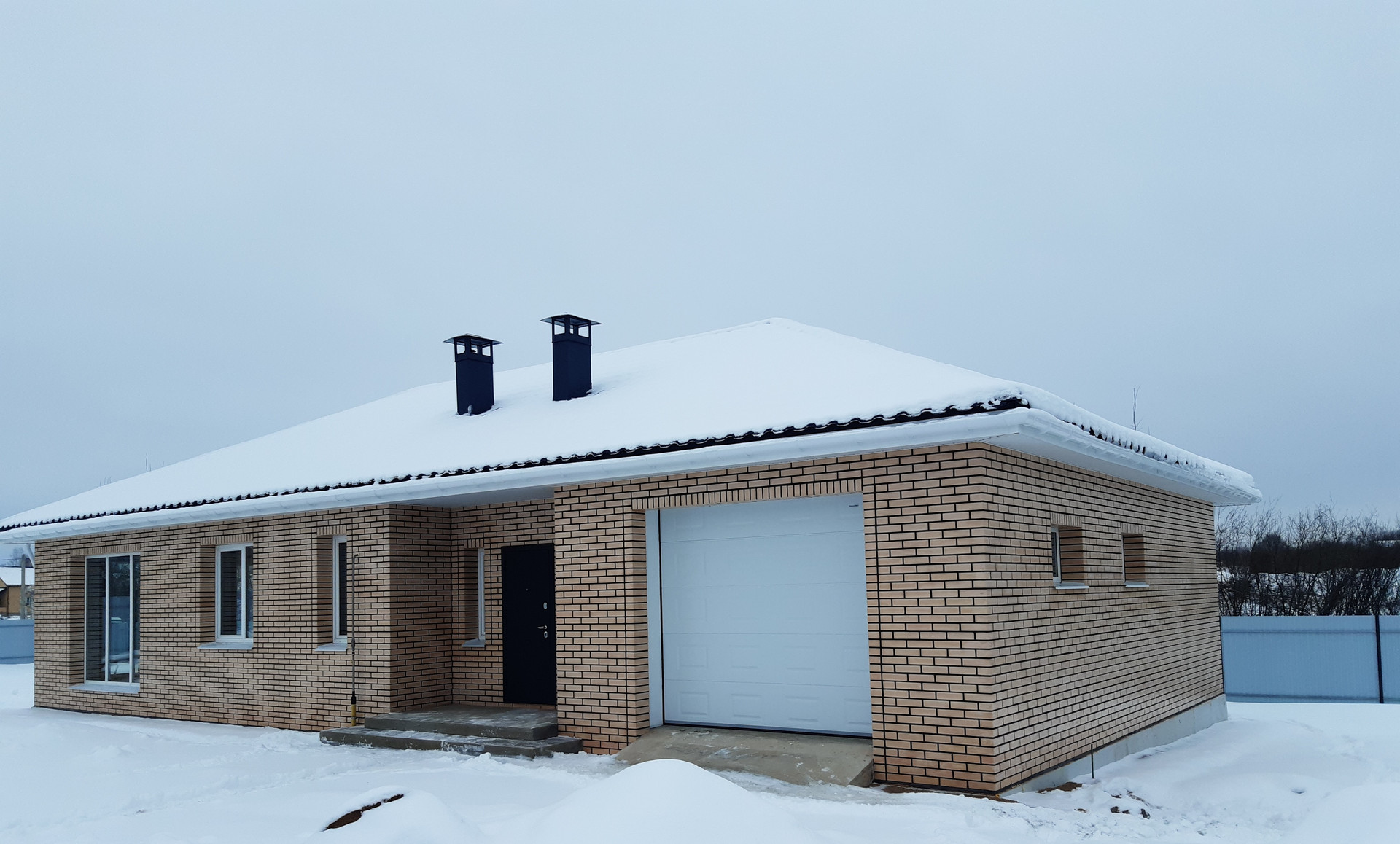 Материал стен – железногорский керамический кирпич, цвет «слоновая кость» и газосиликатный блок 400 мм, плотность d 500. В лицевой кладке кирпича использован черный шов и технология скрытых перемычек.