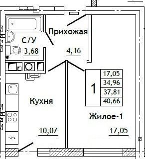 Общая площадь 40.7 м2