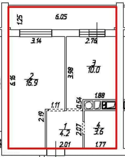 Общая площадь 42.3 м2