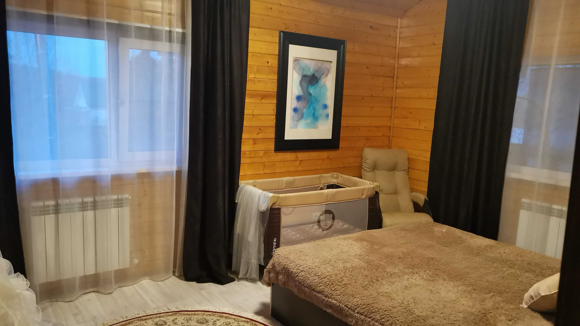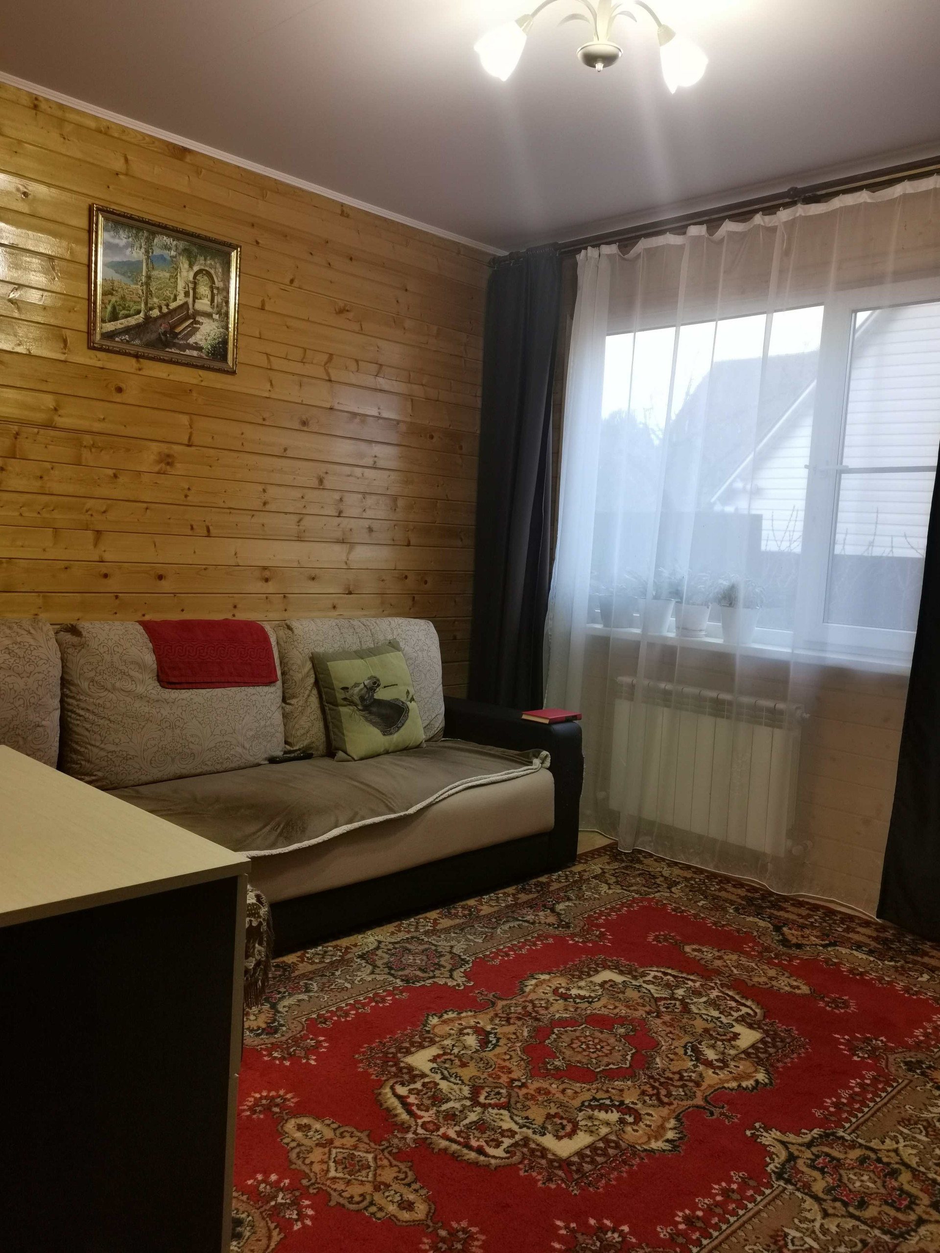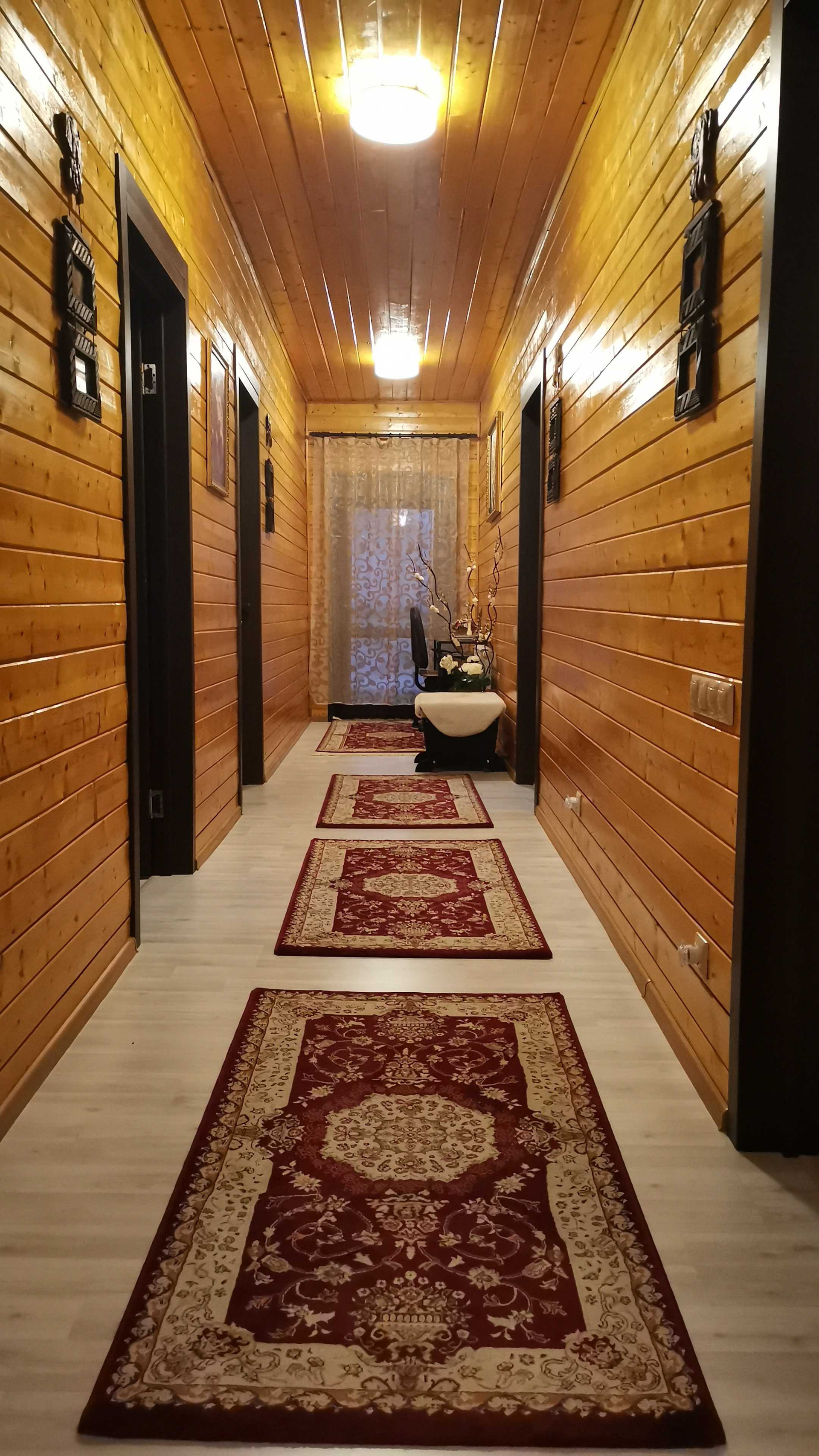 Дом каркасный( снаружи имитация бруса) внутри вагонка потолки натяжные, толщина стен с утеплителем 20 см. Крыша вальмовая (металлочерепица).