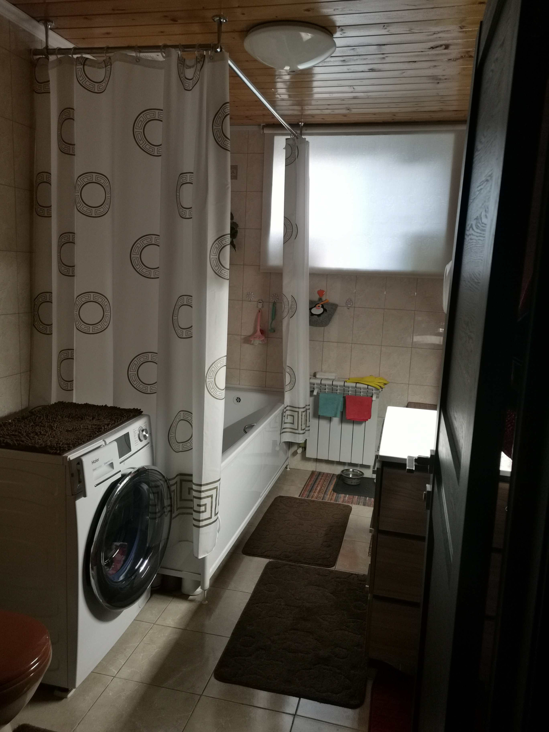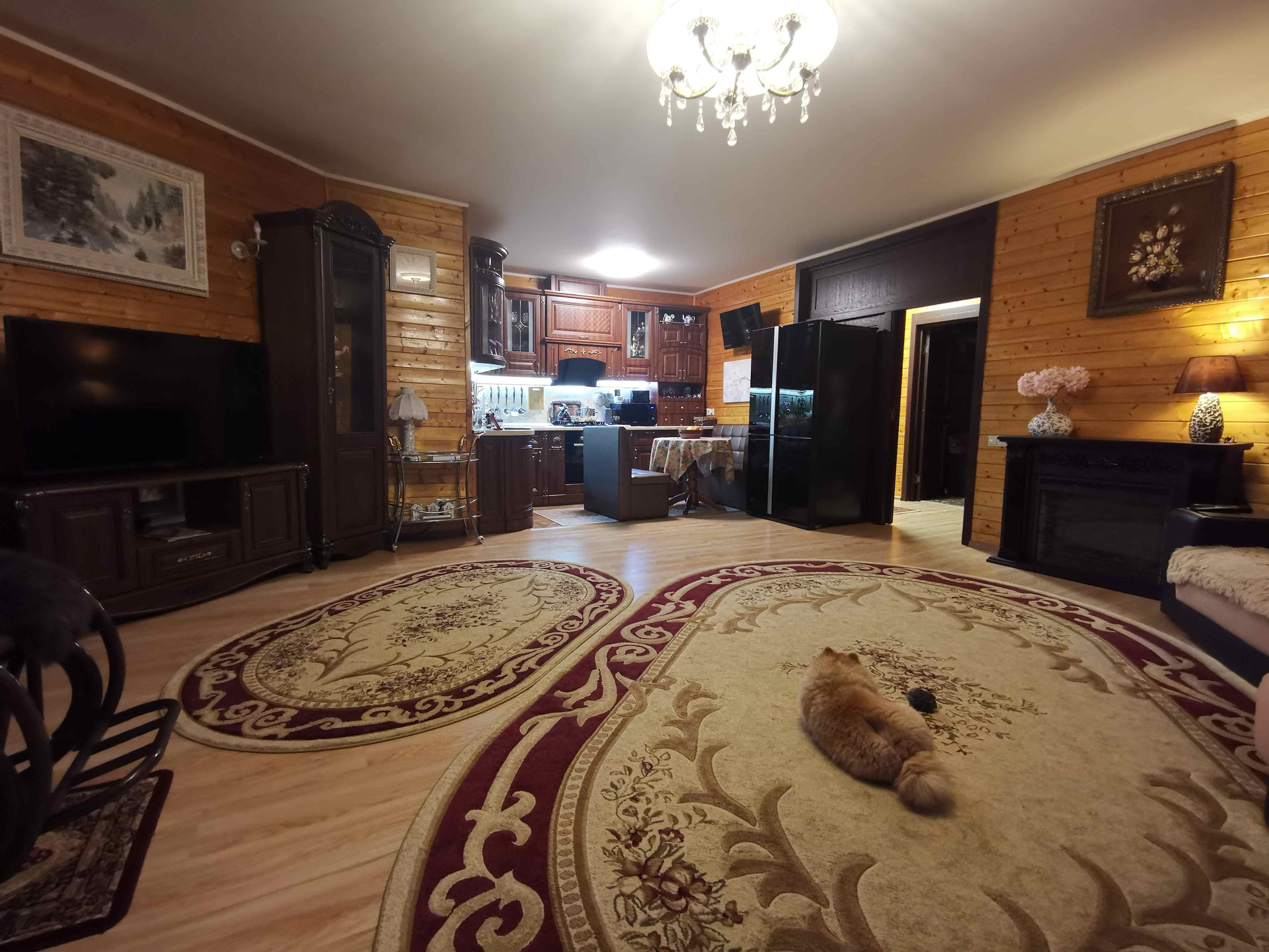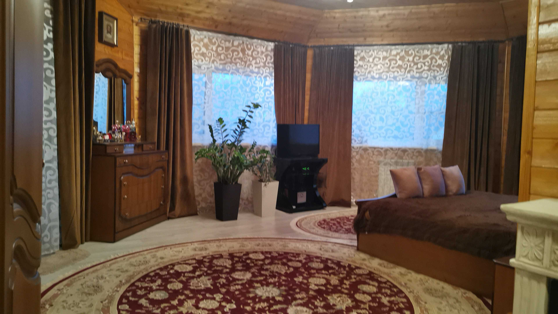 Дом каркасный( снаружи имитация бруса) внутри вагонка потолки натяжные, толщина стен с утеплителем 20 см. Крыша вальмовая (металлочерепица).