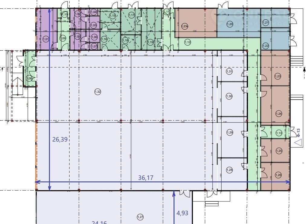 Здание в своей основе имеет несущие колонны, поэтому все перегородки внутри можно сделать по своему усмотрению и можно сделать большое одно-объемное помещение, например под торговый зал.