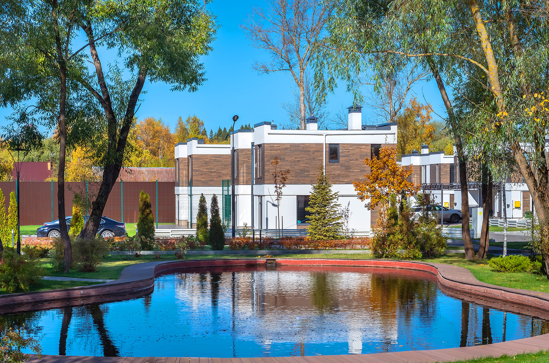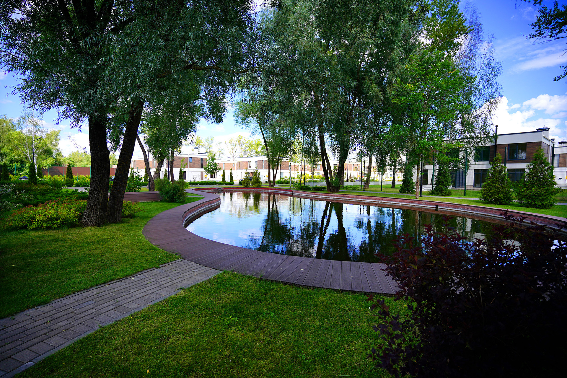 - широкие асфальтированные дороги, прогулочные зоны, пруд с рыбками, детские и спортивные площадки, кафе и магазин, высокоскоростной интернет