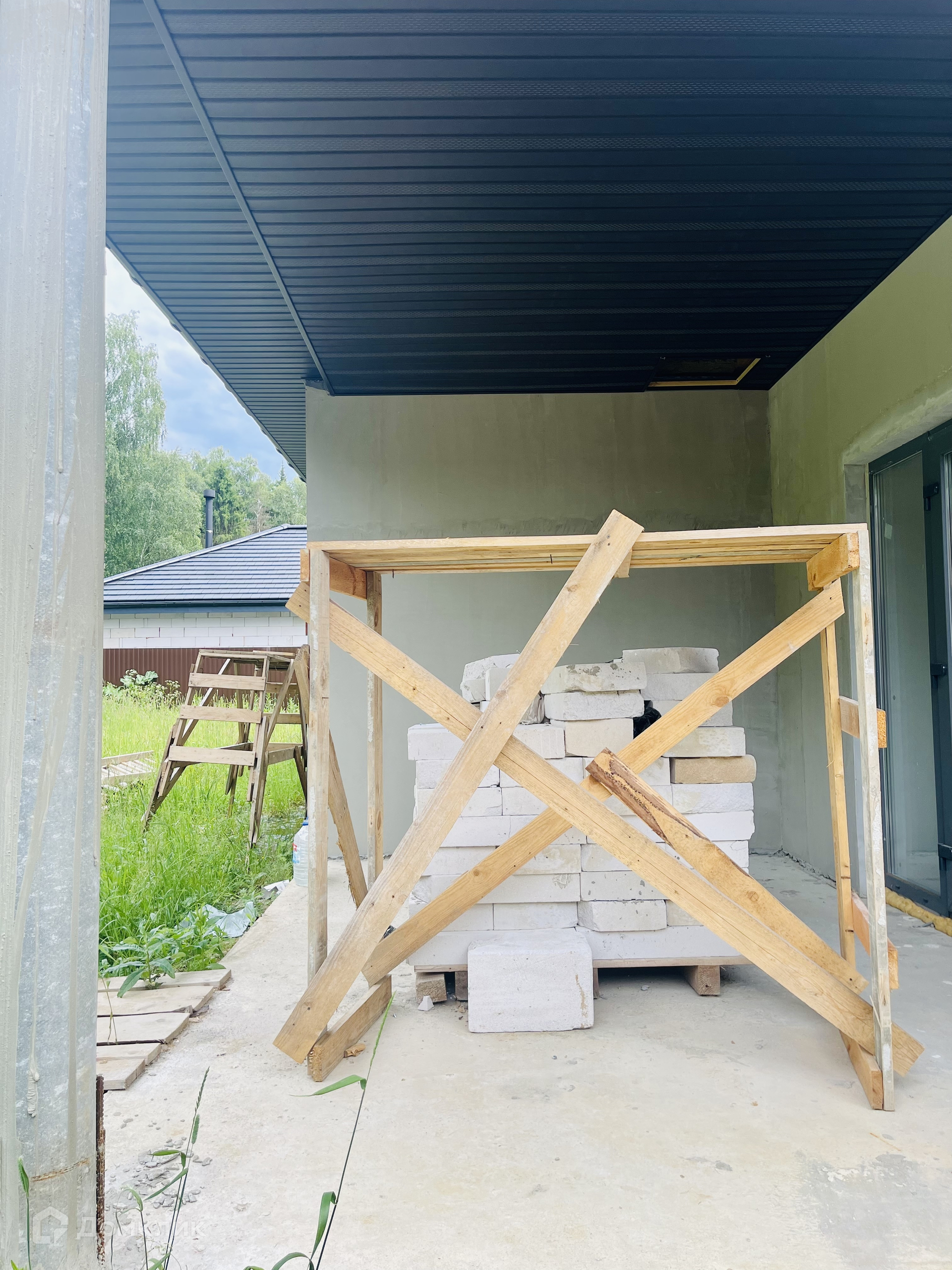 Дом 174,2кв.м, 14х14м, построен из газосиликатного блока 400х250х600мм D500 (производство Беларусь), внешняя отделка: цементная штукатурка, внутренняя:гипсовая тукатурка +цементная в санузлах; Фундамент: лента 400х500мм, сверху плита 200мм; Крыша: металлочерепица , цвет светло-серый; Окна Kaleva 70мм, ламнированные; входная зона: 3х контурная уличная дверь6 покрытие антик-серебро+цинк.