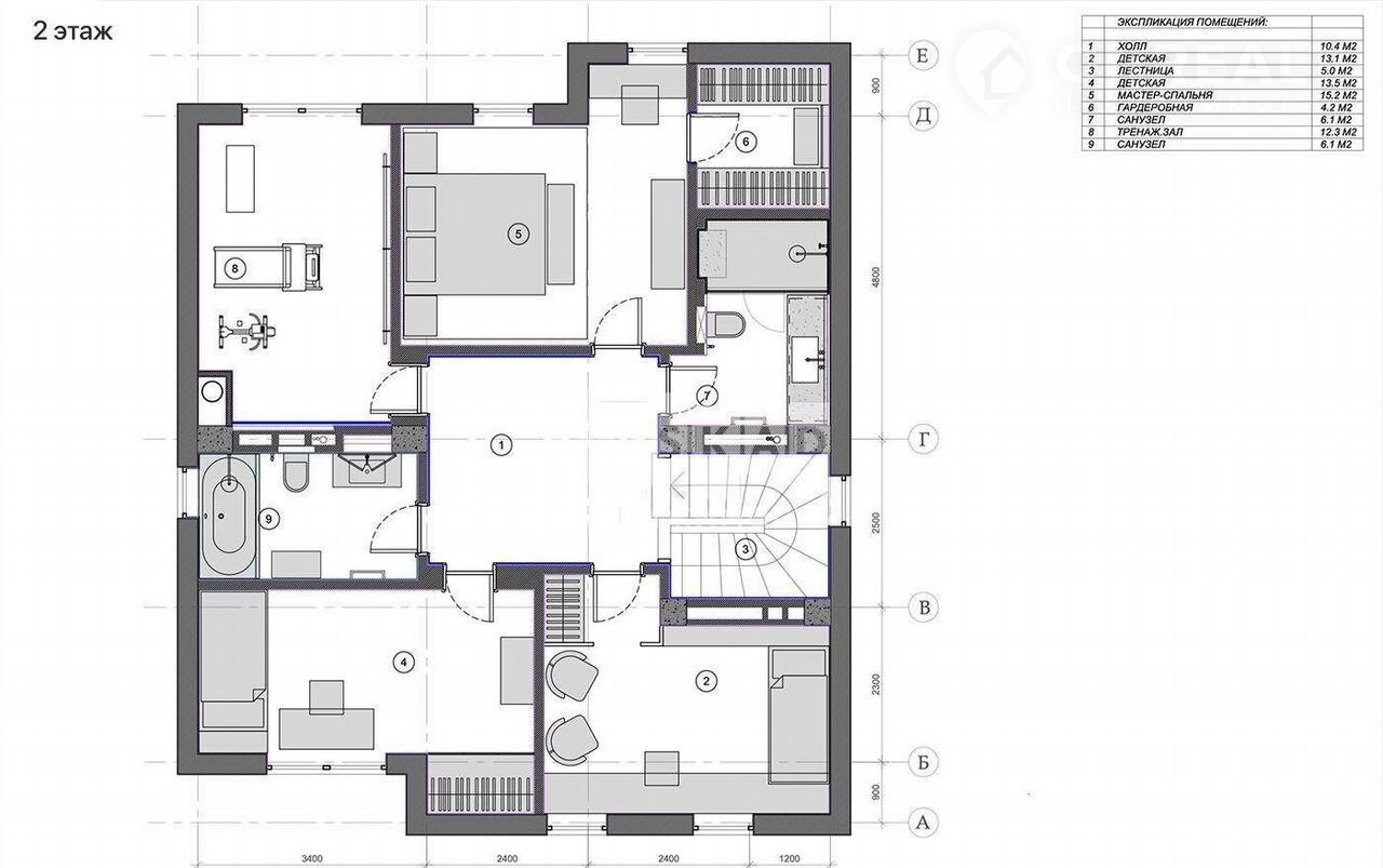 2 этаж: мастер-спальня со своей гардеробной, 2 спальни, 2 санузла, спортивный зал либо кабинет.