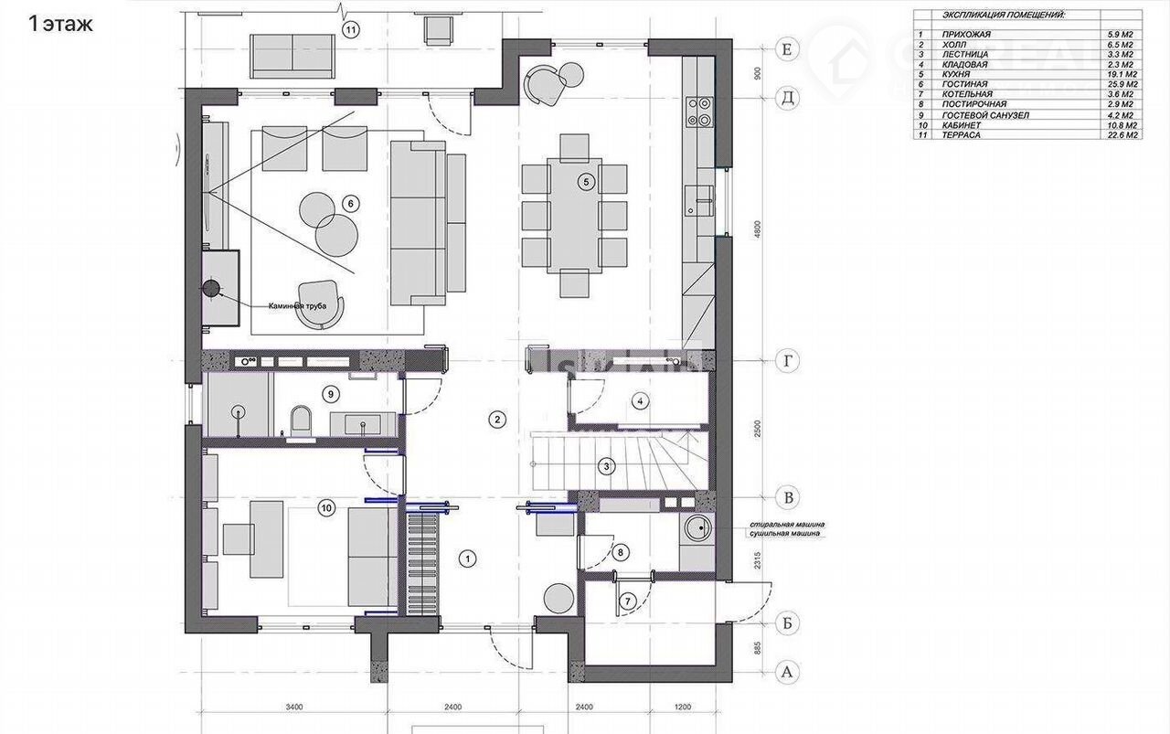 1 этаж: прихожая, гостевая спальня, санузел, гостиная-кухня, гордеробная, постирочная, котельная;