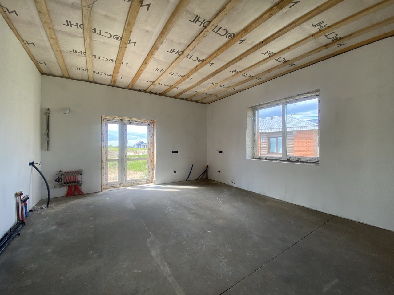 Крыша-мягкая черепица. Потолок утепление 200 минеральная вата. Установлены водостоки. Окна brusbox (качественный трехкамерный стеклопакет).