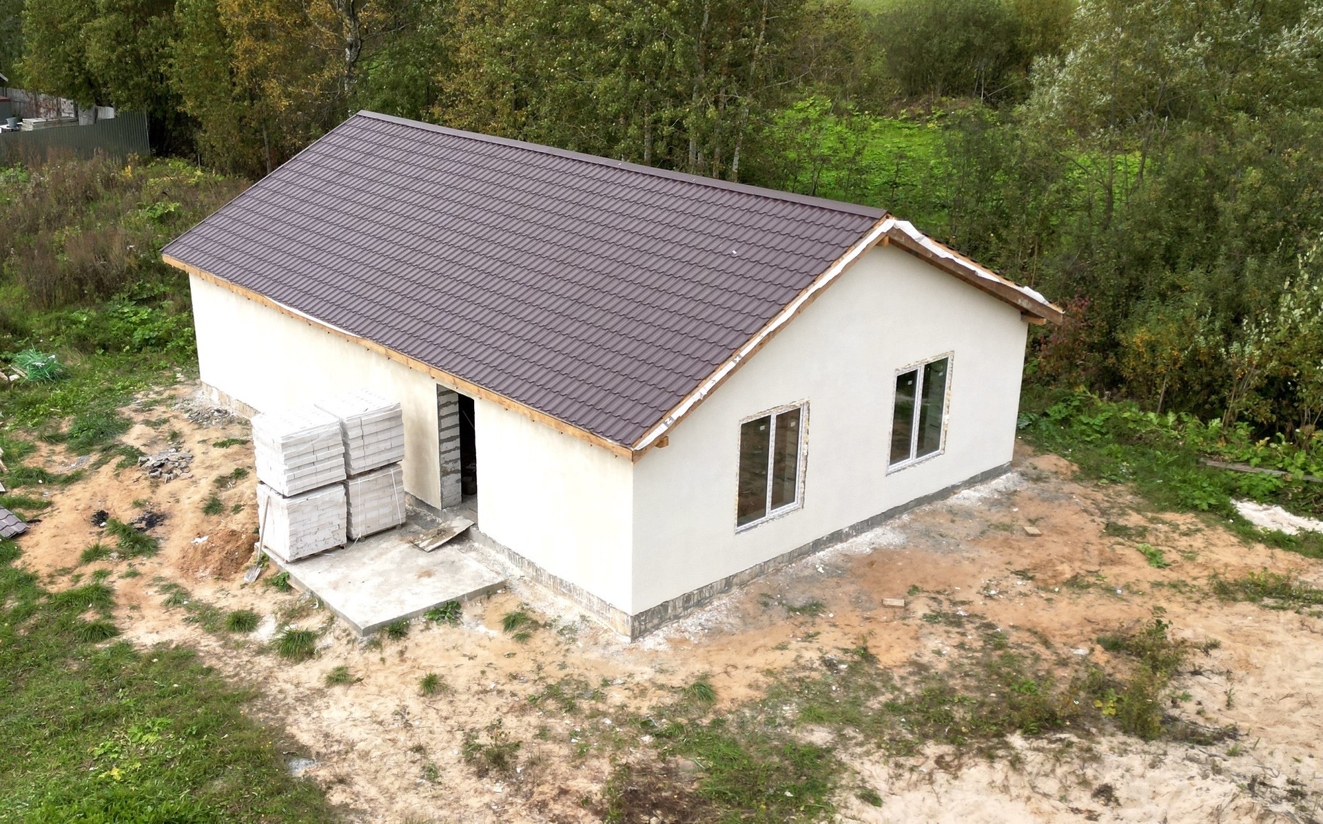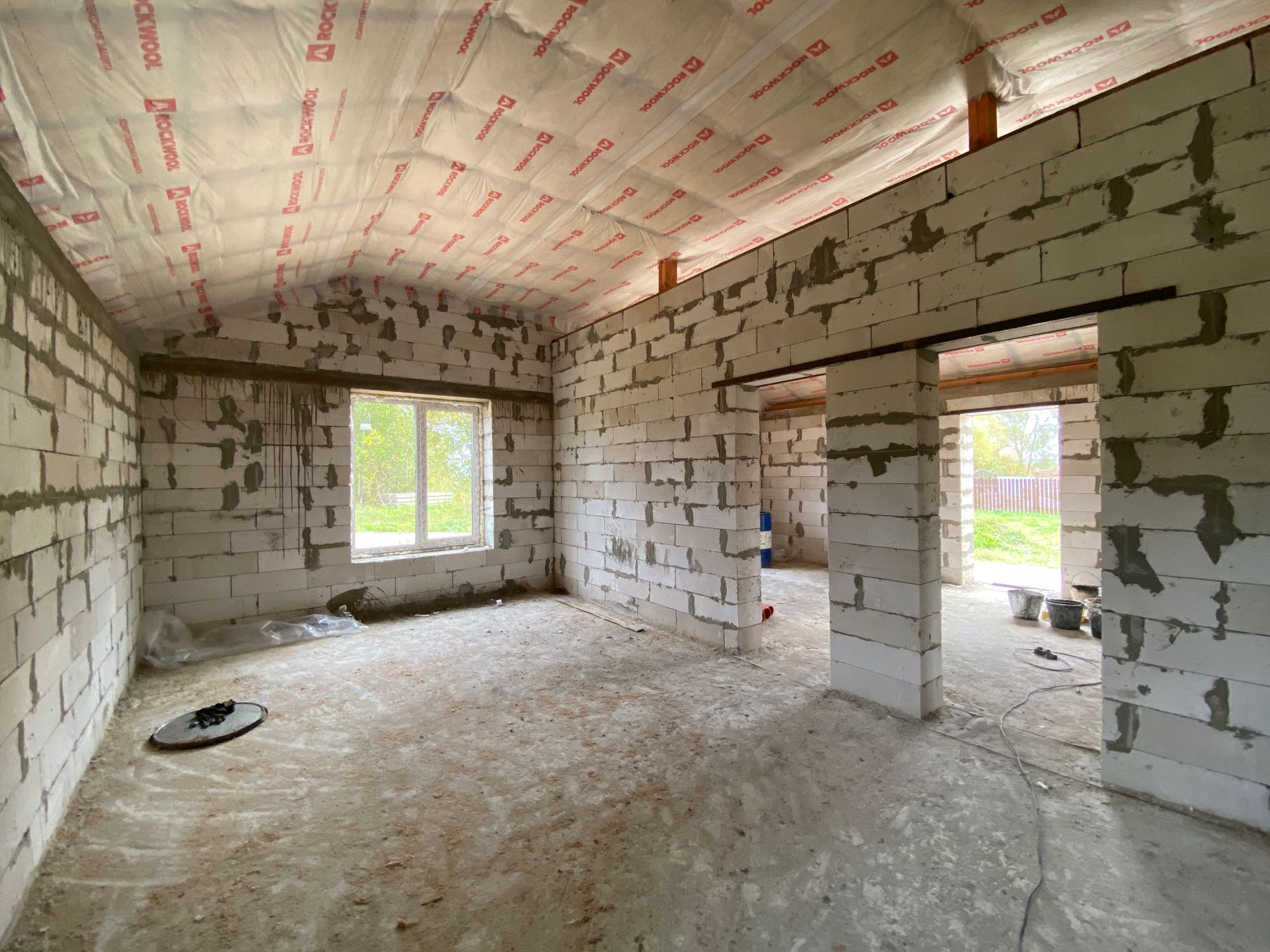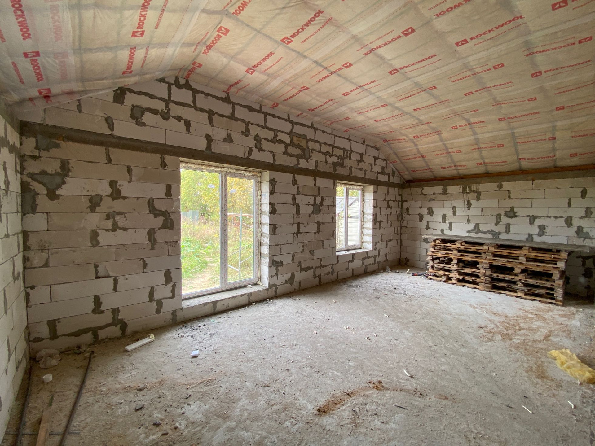 Дом построен из газосиликатных блоков толщиной 400мм, утепление крыши Rockwool 200мм. Фундамент - свайный ростверк. Окна двухкамерные KBE.