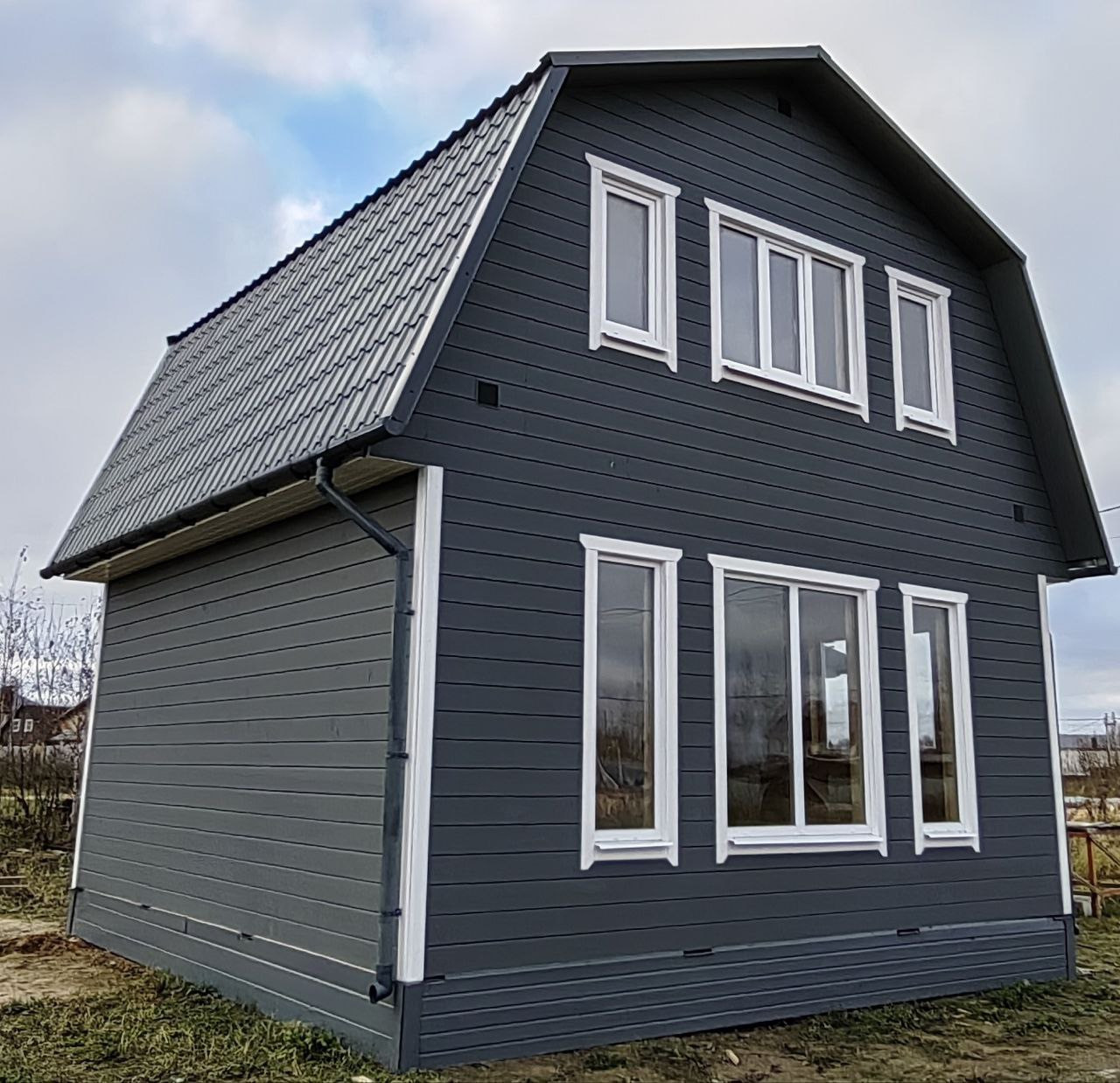 В доме выполнена отделка имитация бруса. Окна пластиковые двухкамерные, в кухне- гостиной панорамное остекление.