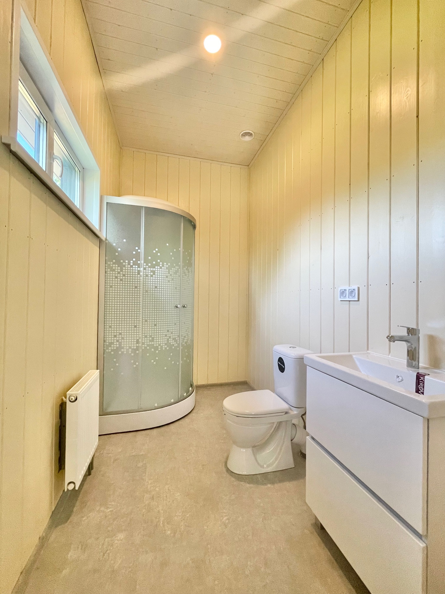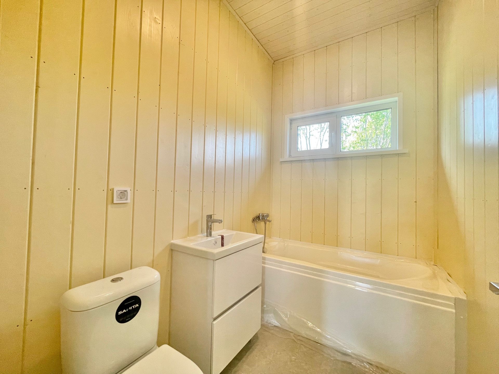 Фасад дома облицован планкеном с помощью скрытых крепежей. Кровля из гибкой черепицы. Оборудованы снегозадержатели и водосточная система, предотвращающие нежелательное воздействие стихии на здание. Фундамент - железобетонные сваи, лучший вариант для местного типа грунта. Окна двухкамерные, с толщиной профиля 70 мм. Входная дверь антивандальная, межкомнатные одностворчатые. Покрытия террасы - древесно-полимерный композит, ограждения из закаленного стекла. Внутренняя отделка стен выполнена из окрашенной на производстве имитации бруса.