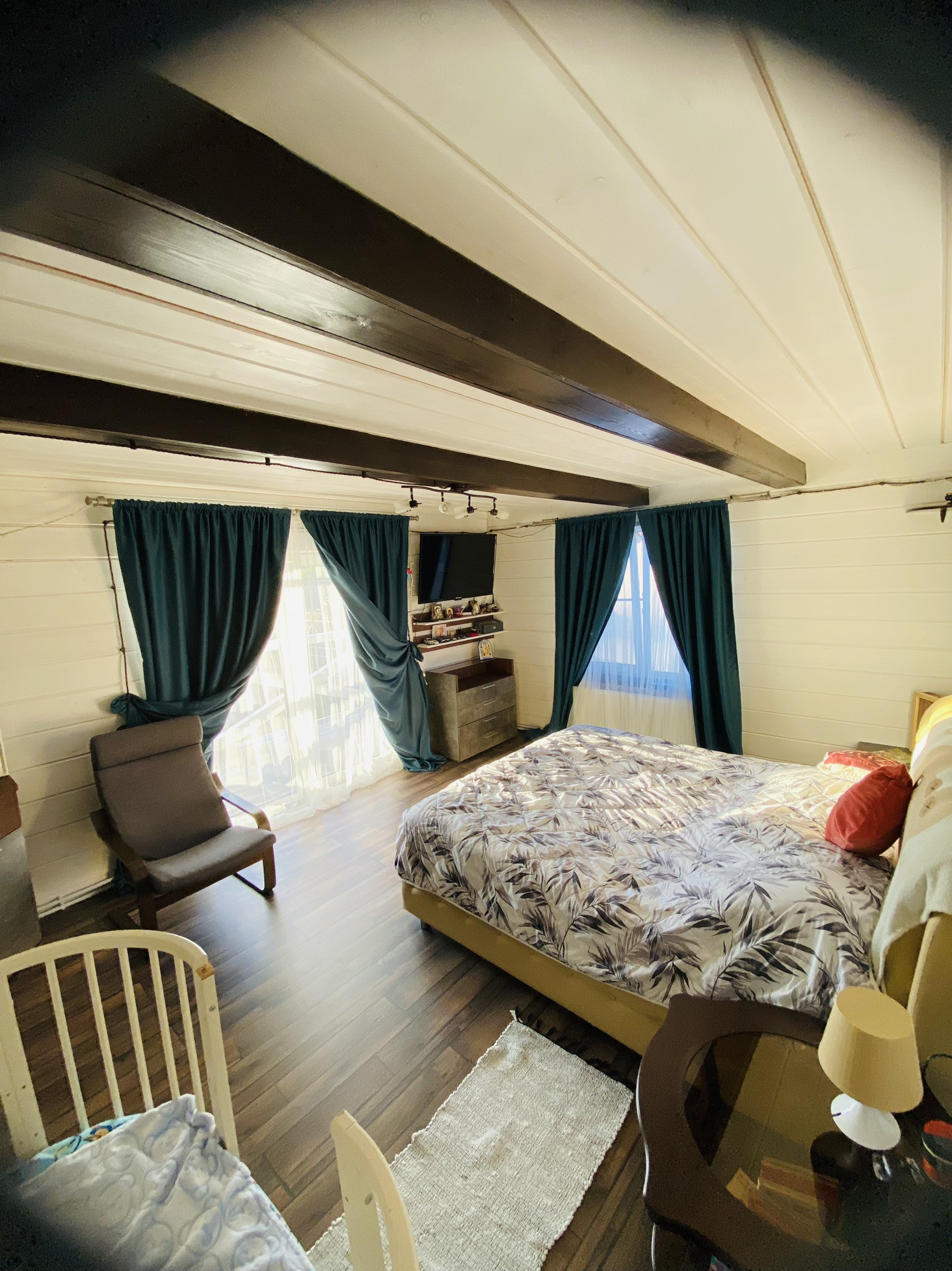 На 2 этаже 1 спальня с панорамными окнами и выходом на открытый балкон, где открывается вид на двор и живописные закаты, детская спальня, санузел с ванной, гардеробная комната(9кв.м) просторный холл с домашним кинотеатром.