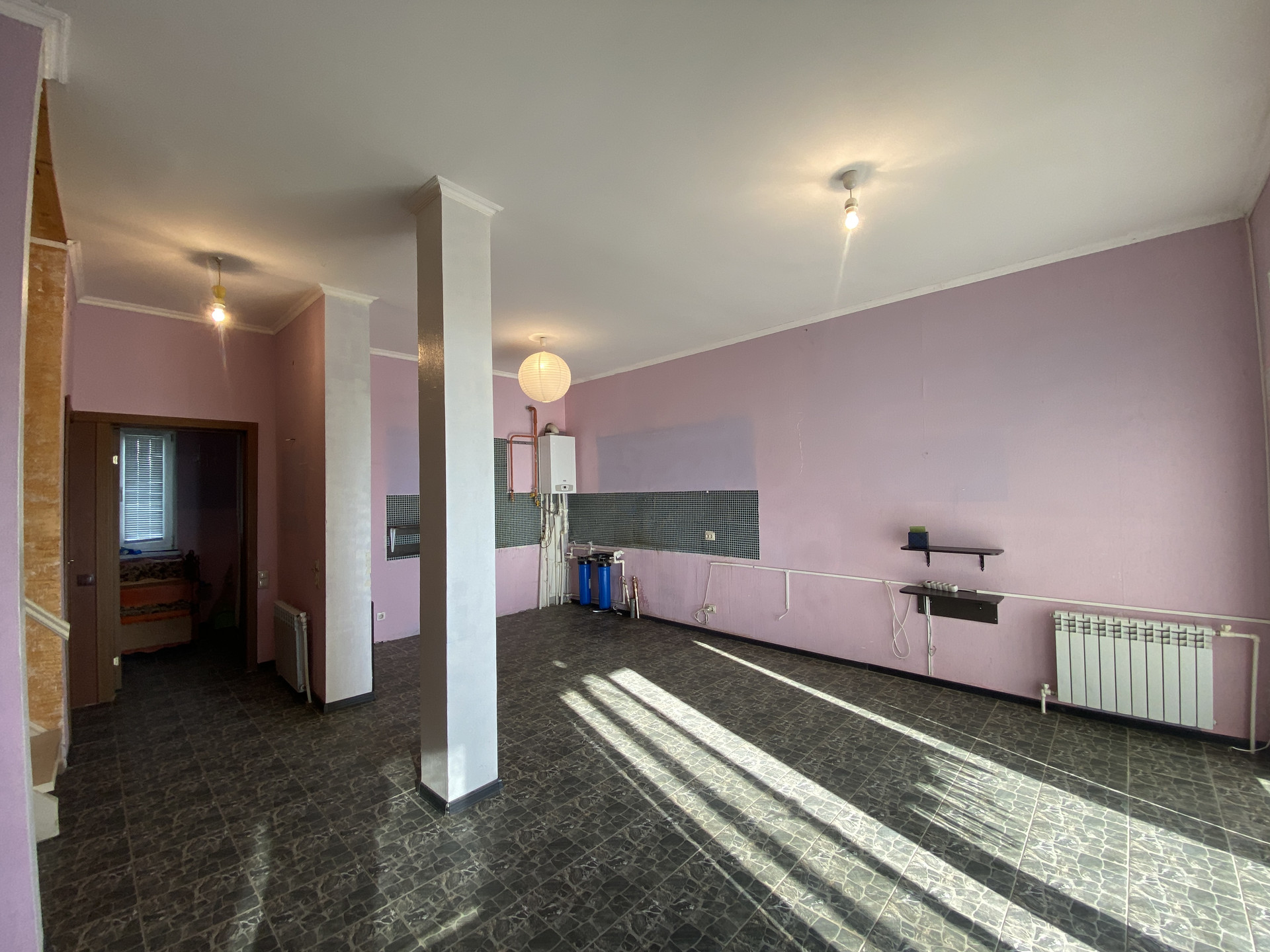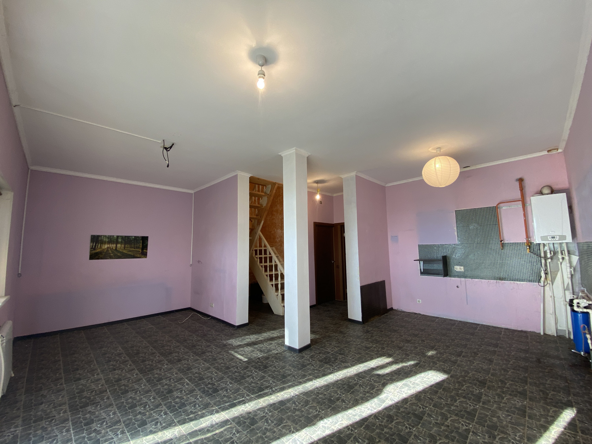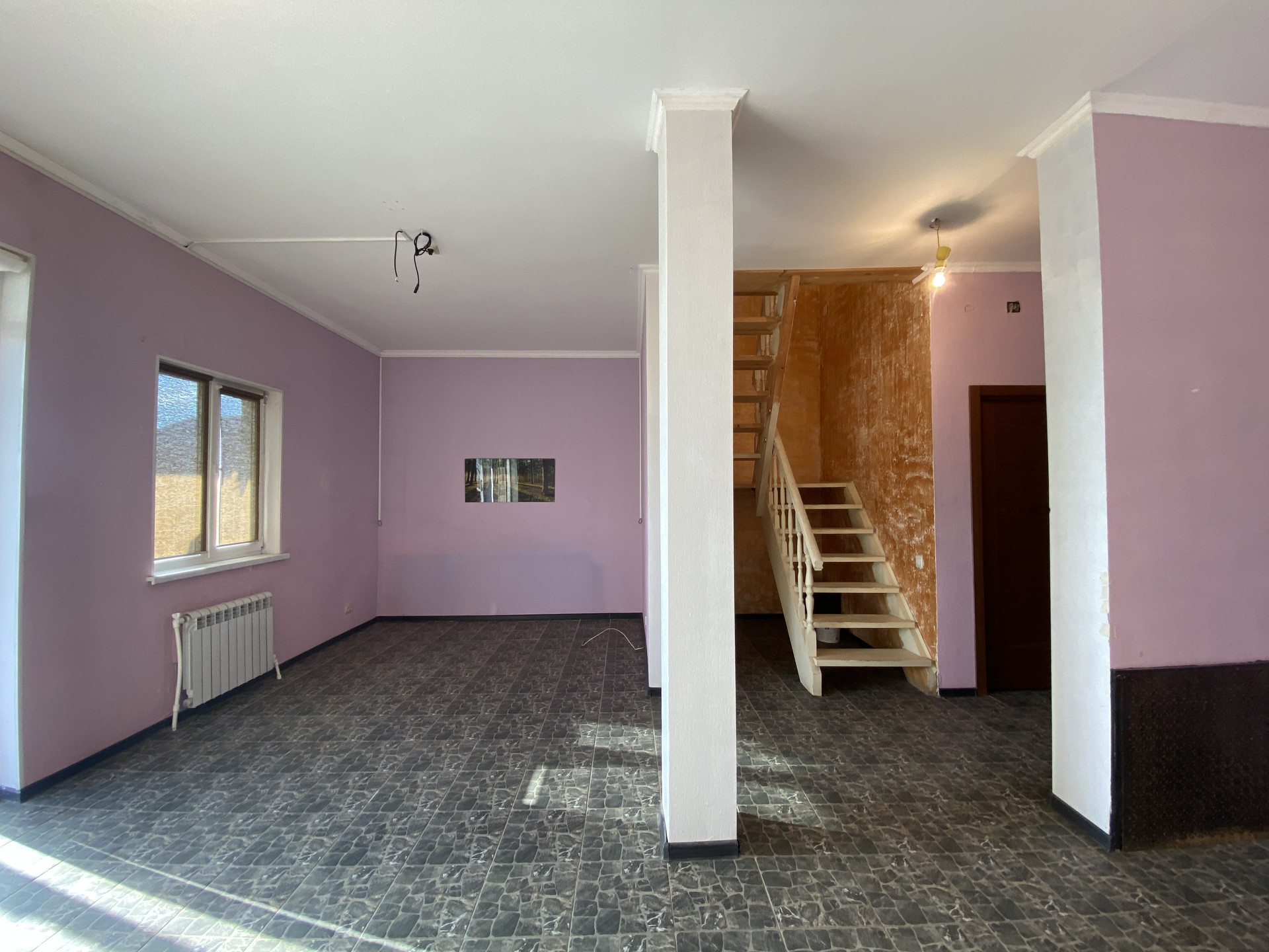 Первый этаж: просторная кухня-гостиная с камином, санузел, прихожая. Теплый пол.