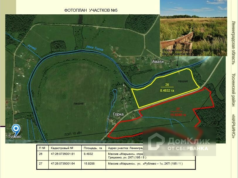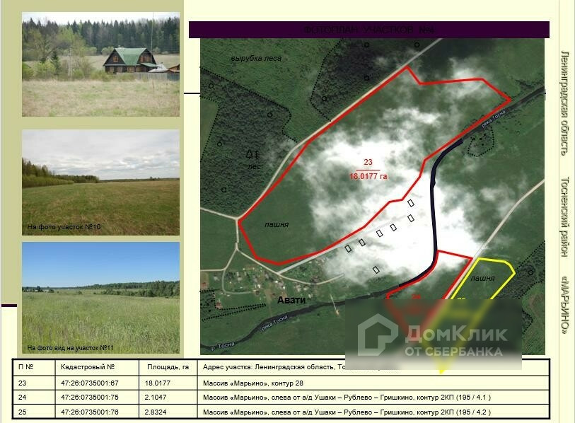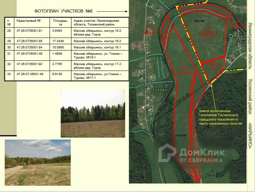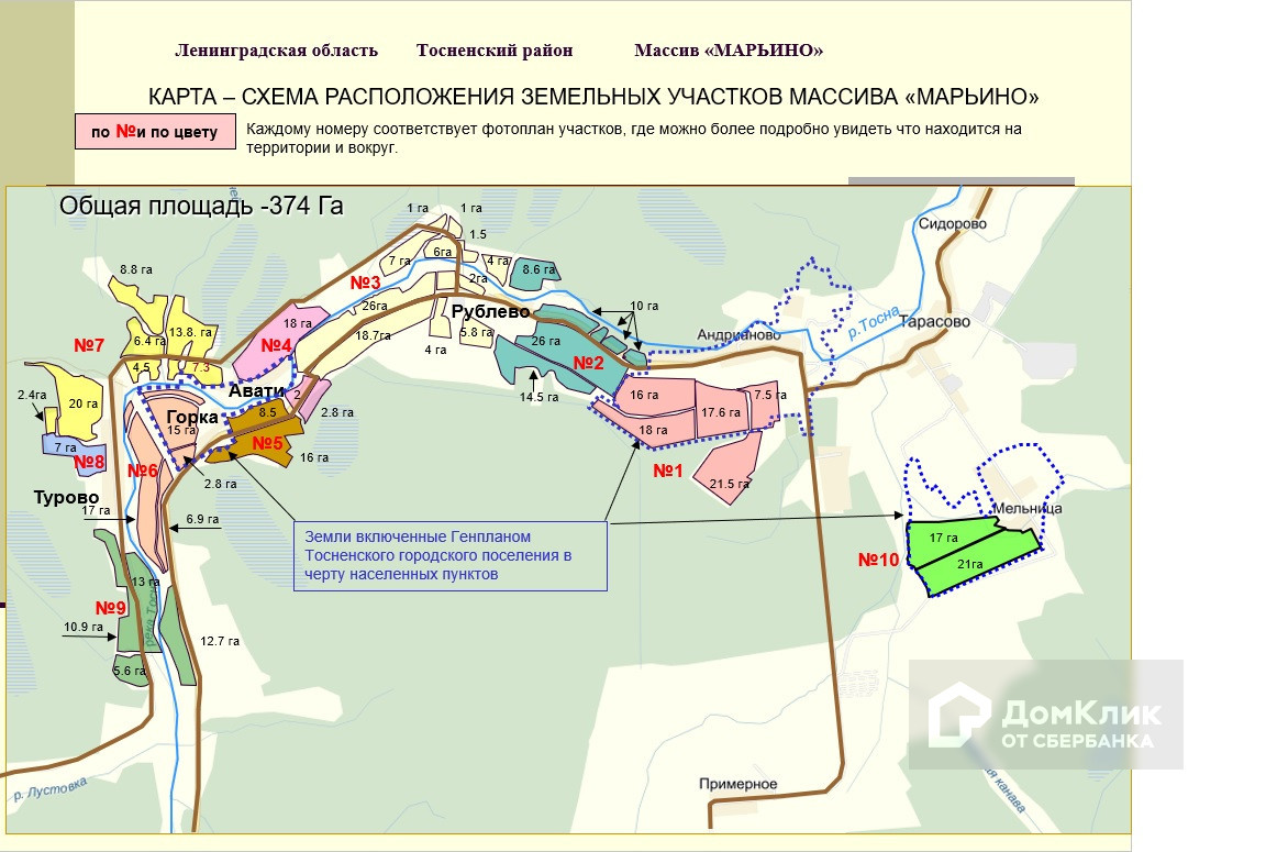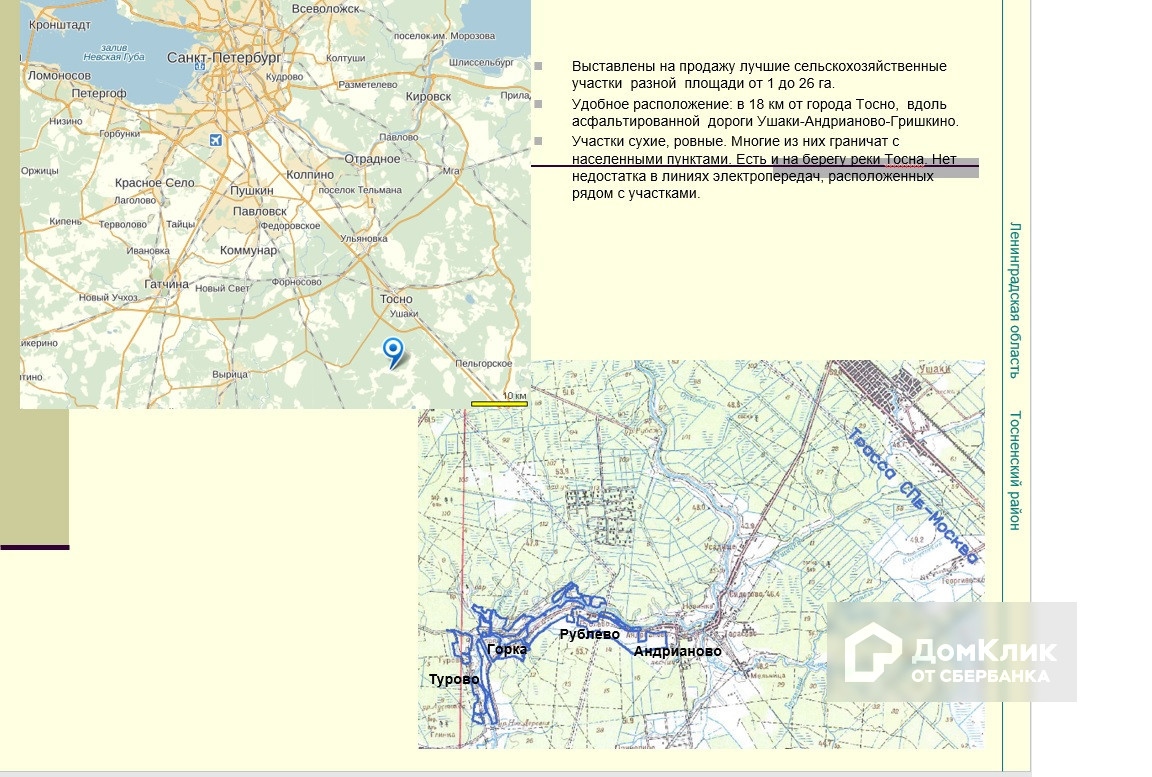 Земельные участки общей площадью 370 га в Тосненском районе.  Великолепные участки в районе поселков Тарасово, Рублево, Горка, Турово, Авати, Андрианово. Удобное расположение: в 18 км от города Тосно, вдоль асфальтированной дороги Ушаки-Андрианово-Гришкино. Участки сухие, ровные. Многие из них граничат с населенными пунктами. Есть и на берегу реки Тосна. Нет недостатка в линиях электропередач, расположенных рядом с участками. Категория земель – земли сельскохозяйственного назначения. Разрешенное использование – ведение сельского хозяйства. 60 км от КАД.