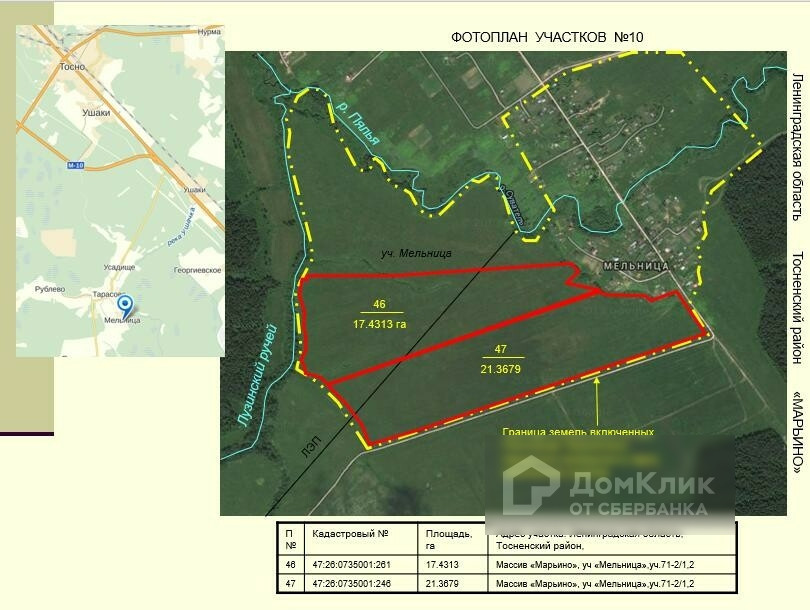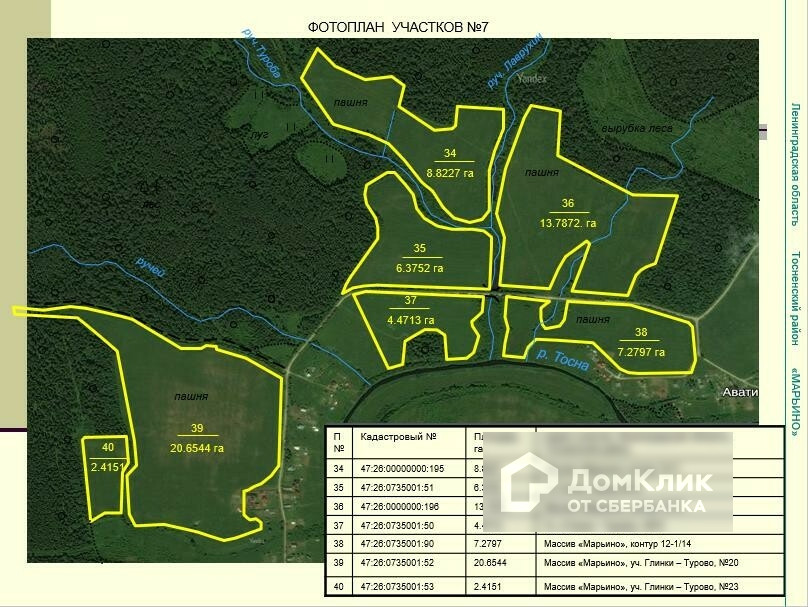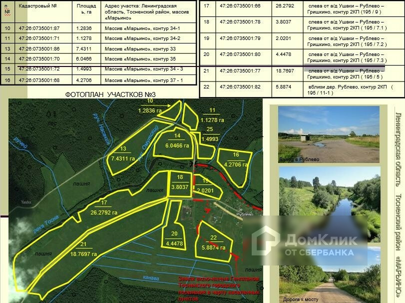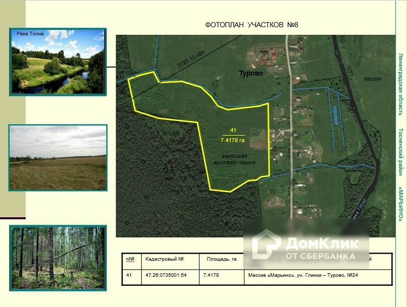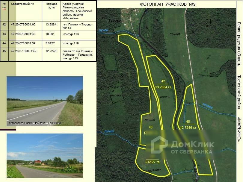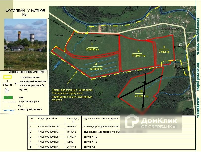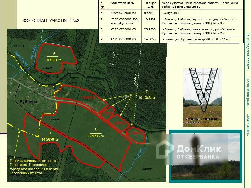 Земельные участки общей площадью 370 га в Тосненском районе.  Великолепные участки в районе поселков Тарасово, Рублево, Горка, Турово, Авати, Андрианово. Удобное расположение: в 18 км от города Тосно, вдоль асфальтированной дороги Ушаки-Андрианово-Гришкино. Участки сухие, ровные. Многие из них граничат с населенными пунктами. Есть и на берегу реки Тосна. Нет недостатка в линиях электропередач, расположенных рядом с участками. Категория земель – земли сельскохозяйственного назначения. Разрешенное использование – ведение сельского хозяйства. 60 км от КАД.
