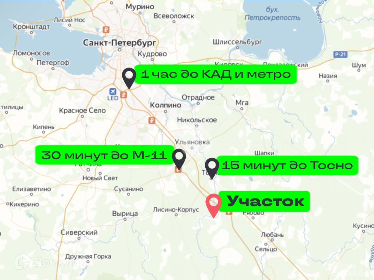 До Санкт-Петербурга можно доехать на автомобиле по Московскому шоссе М-10 за 1 час, либо по скоростной трассе М- 11 (съезд под Тосно).Автобусная остановка рядом с домом. За 15 минут можно доехать до г. Тосно на автобусе № 327 (ходит раз в час). Из Тосно ходит скоростная электричка Ласточка до Московского вокзала (время в пути около 35 минут) и маршрутка до метро Купчино (в пути 35-45 минут в зависимости от пробок).Участок расположен рядом с объектом культурного наследия и это дает ряд преимуществ, а именно: администрация следит за дорогами, своевременно проводится расчистка от снега, ремонт.