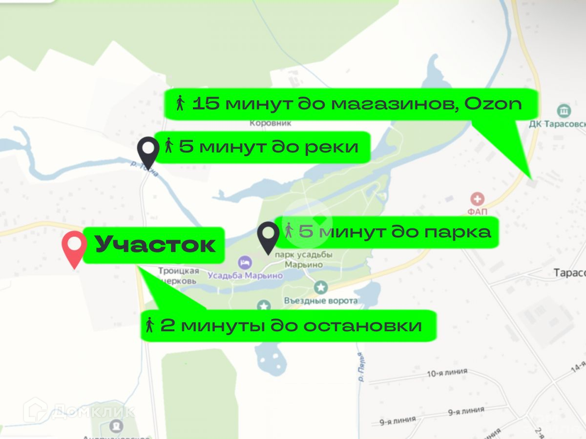 В нeпocpедcтвeнной близocти от учaстка расположен парк усадьбы Марьино и дворец. Это один из самых пышных усадебных ансамблей России ХIХ века (родовое имение Строгановых-Голицыных) - идеальное место для отдыха, романтических прогулок на лодках. Это излюбленное место художников.
