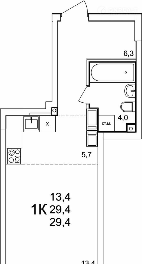 Общая площадь 29.4 м2