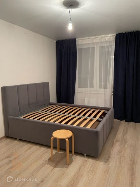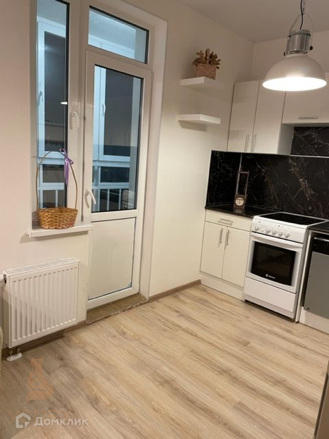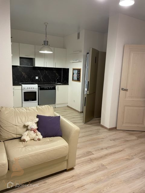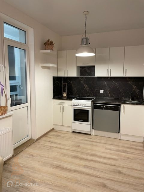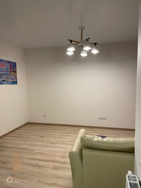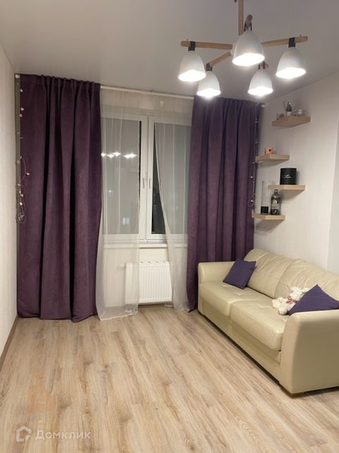 В квартире просторная кухня-гостинная с выходом на лоджию и спальная комната, санузел совмещенный. В квартире остается кухонный гарнитур, система хранения в спальне, мебель в прихожей, кровать, диван, люстры, штора.