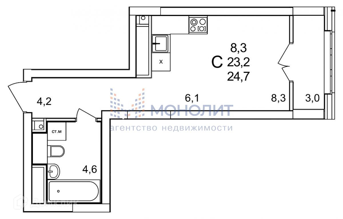 Общая площадь 24.7 м2