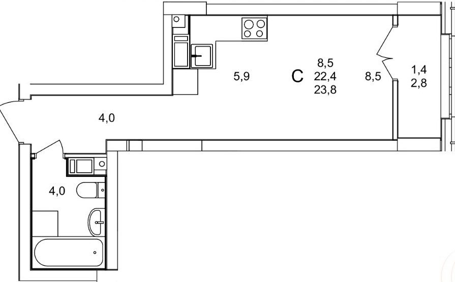 Общая площадь 23.8 м2
