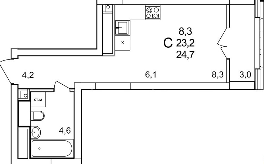 Общая площадь 24.7 м2
