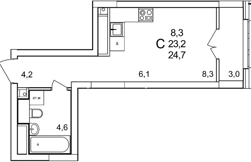 Общая площадь 24.7 м2