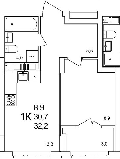 Общая площадь 32.2 м2