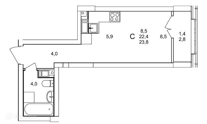 Общая площадь 23.8 м2