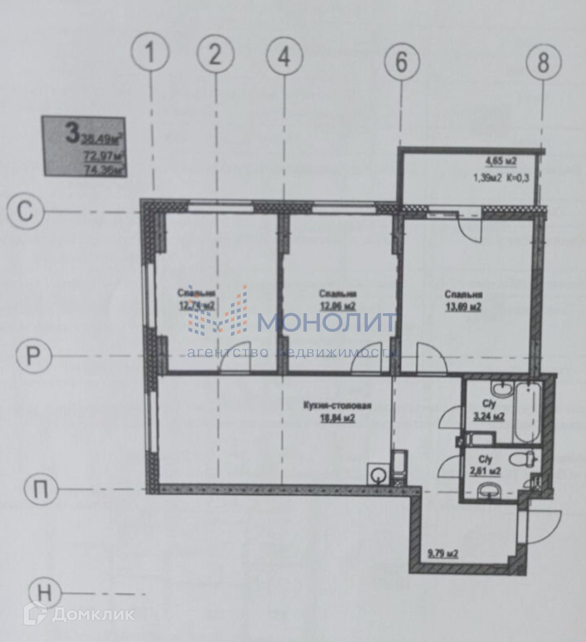 Жилая площадь 38.49 м2