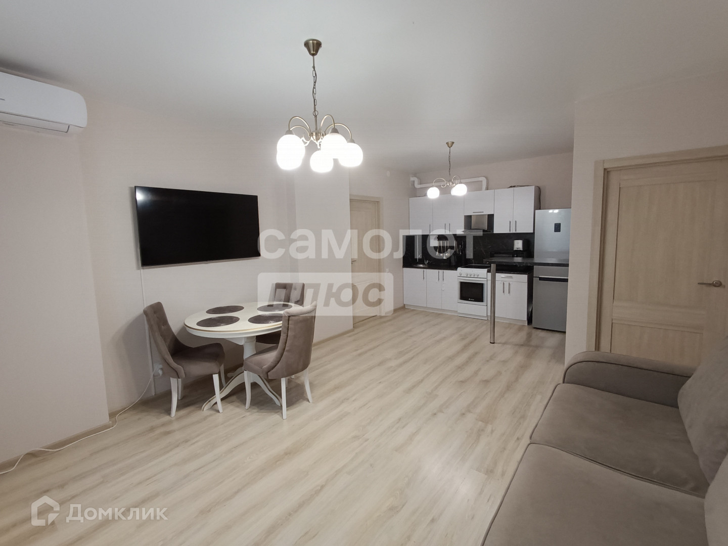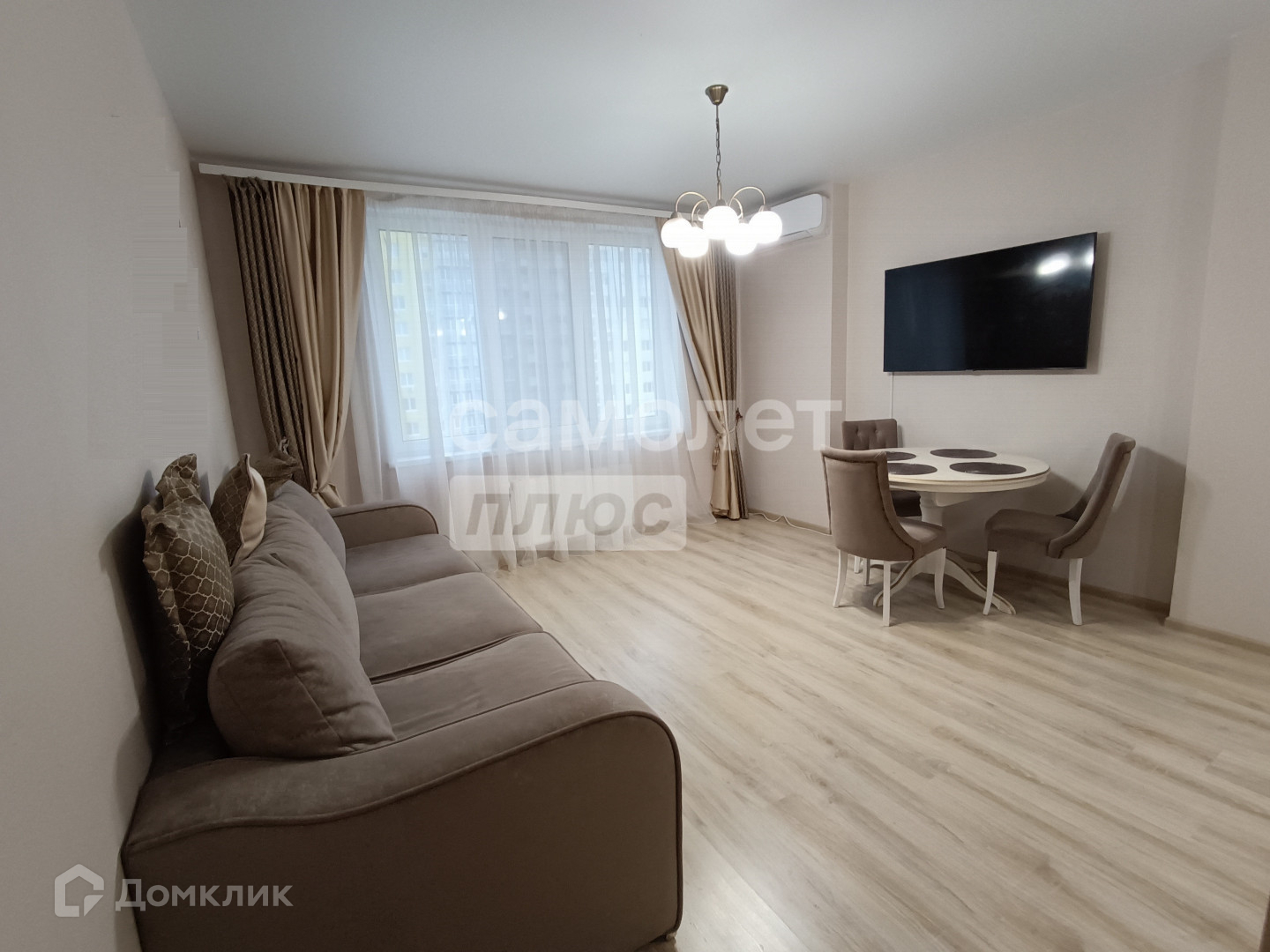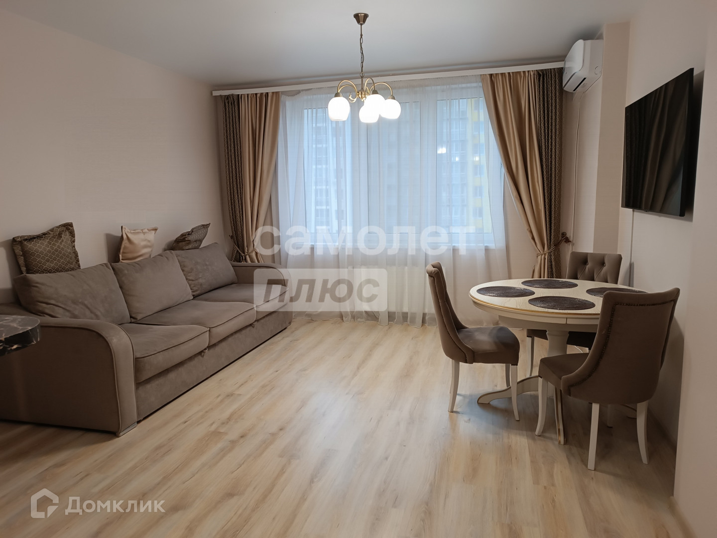 В гостиной установлен кондиционер, окна стеклопaкеты, пол ламинат, натяжные потолки,