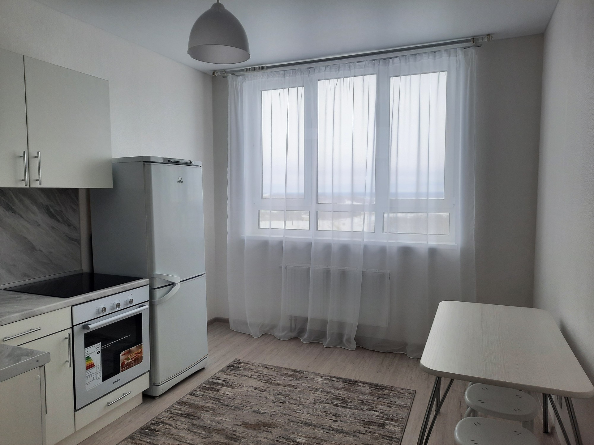 В квартире имеется всё необходимое для комфортного проживания: холодильник,стир.машина,кухонный гарнитур со встроенной электр.варочной панелью и духовым шкафом от застройщика, диван, стенка, телевизор, кухонный стол и стулья, электр.чайник.
