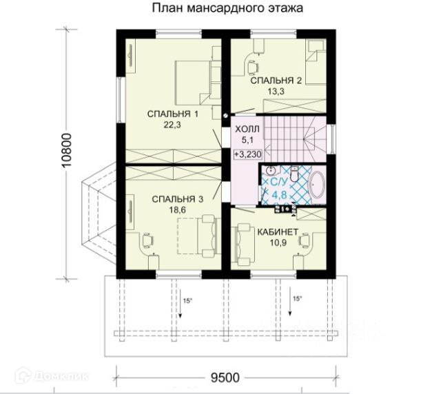 Второй этаж: Комнаты - 13,3 + 18,6 + 22,3 кв.м. СУ совмещенный (может быть гардеробом) - 4,8 кв.м. Кабинет (может быть сан. узлом) - 10,9 кв.м. Холл - 5,1 кв.м.
