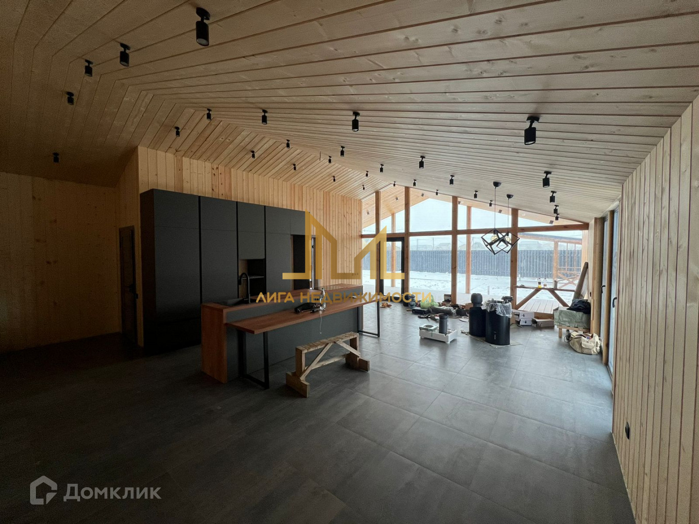 Просторная кухня-гостиная с панорамным остеклением позволит проводить уютные семейные вечера, а так же принимать большое количество гостей.
