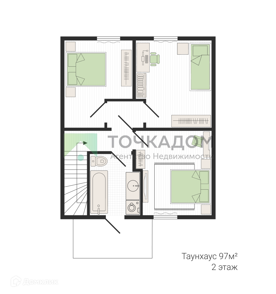 На первом этаже расположена просторная и уютная гостиная комната, а также совмещенная кухня-столовая, санузел. Здесь же располагается лестница на второй этаж, где также есть отдельный санузел, 2 большие спальные комнаты и 1 гостевая, которая может быть переоборудована в кабинет. Кроме того, со второго этажа предусмотрен выход на небольшой балкон.