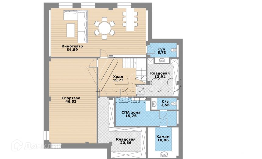Цоколь: спортзал, кинотеатр, зона спа, подсобные помещения.