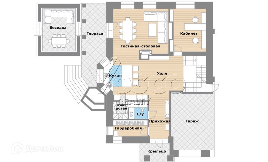 1-й этаж: гостиная с выходом на террасу, кухня с кладовой, столовая, холл, кабинет, гардеробная, с/у, гараж на два автомобиля;