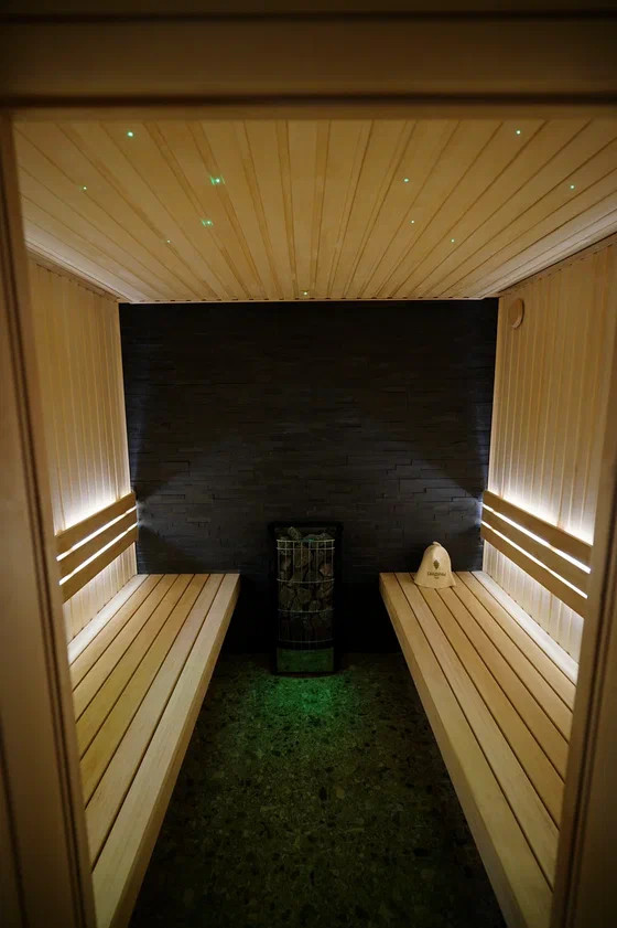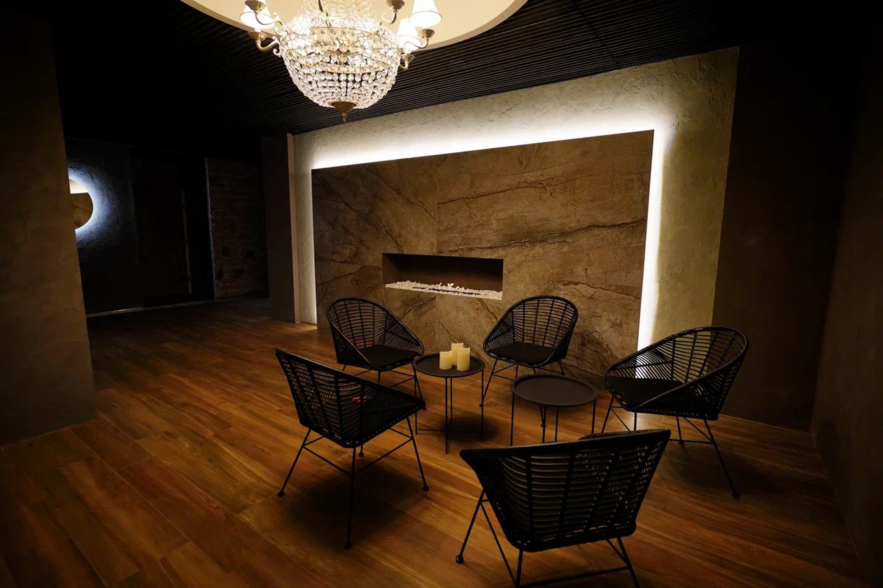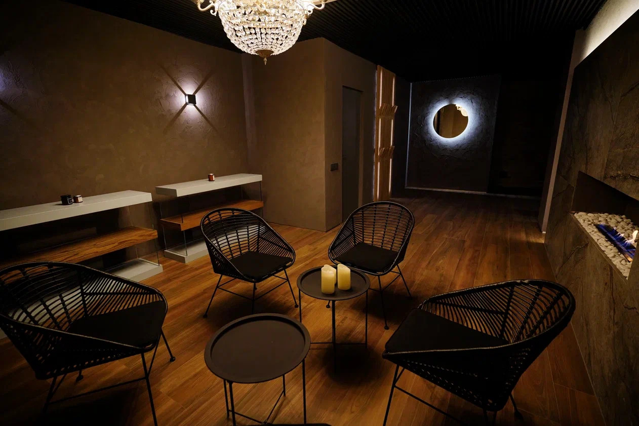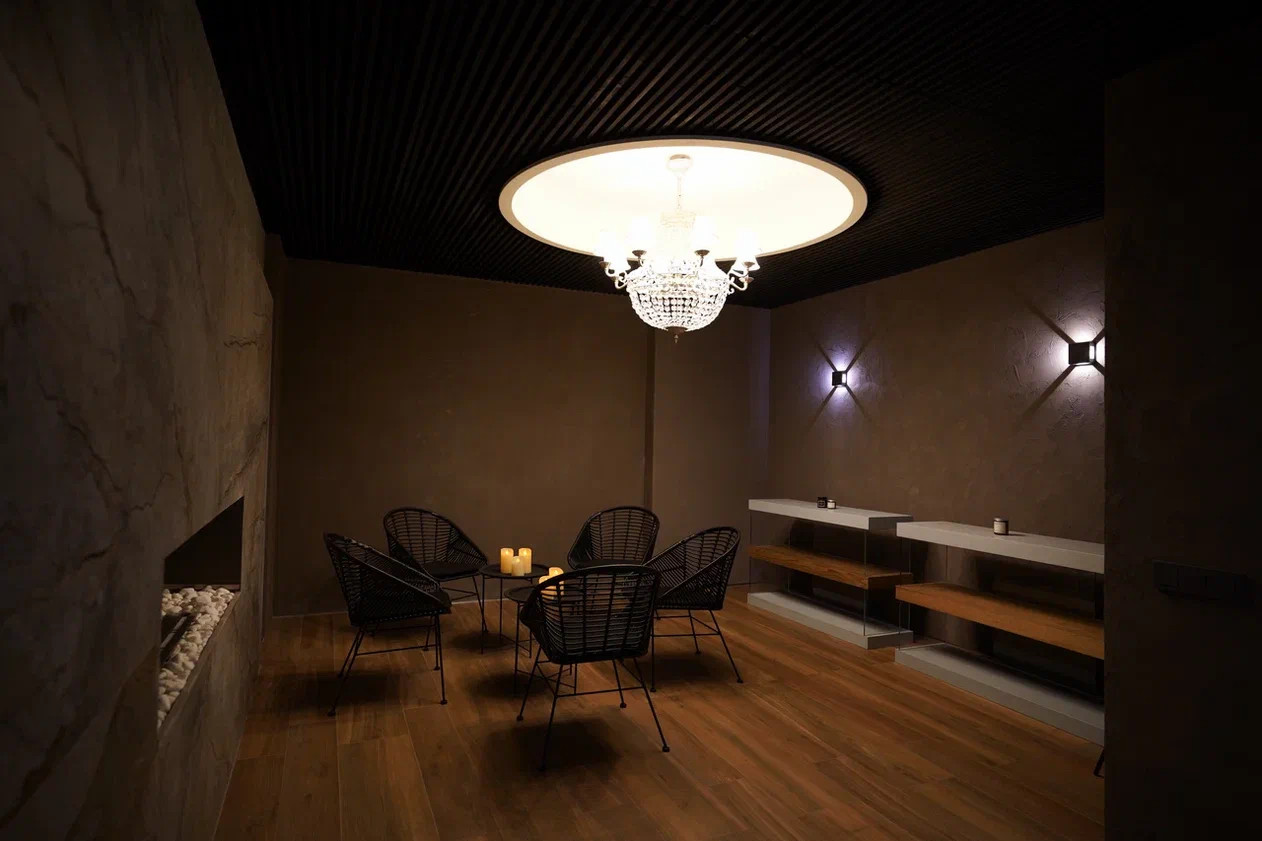 SPA зона - сауна ( установлено оборудование HARVIA, в том числе Звёздное небо), хаммам, душевые с обливным устройством финского производителя SAWO, камерная комната отдыха с биокамином и роскошной Итальянской люстрой, санузел.