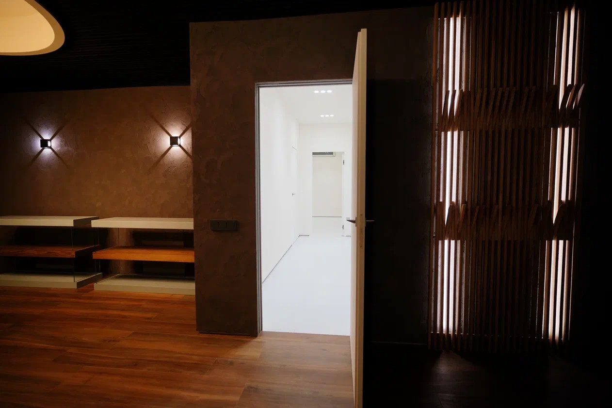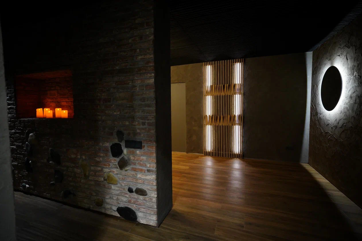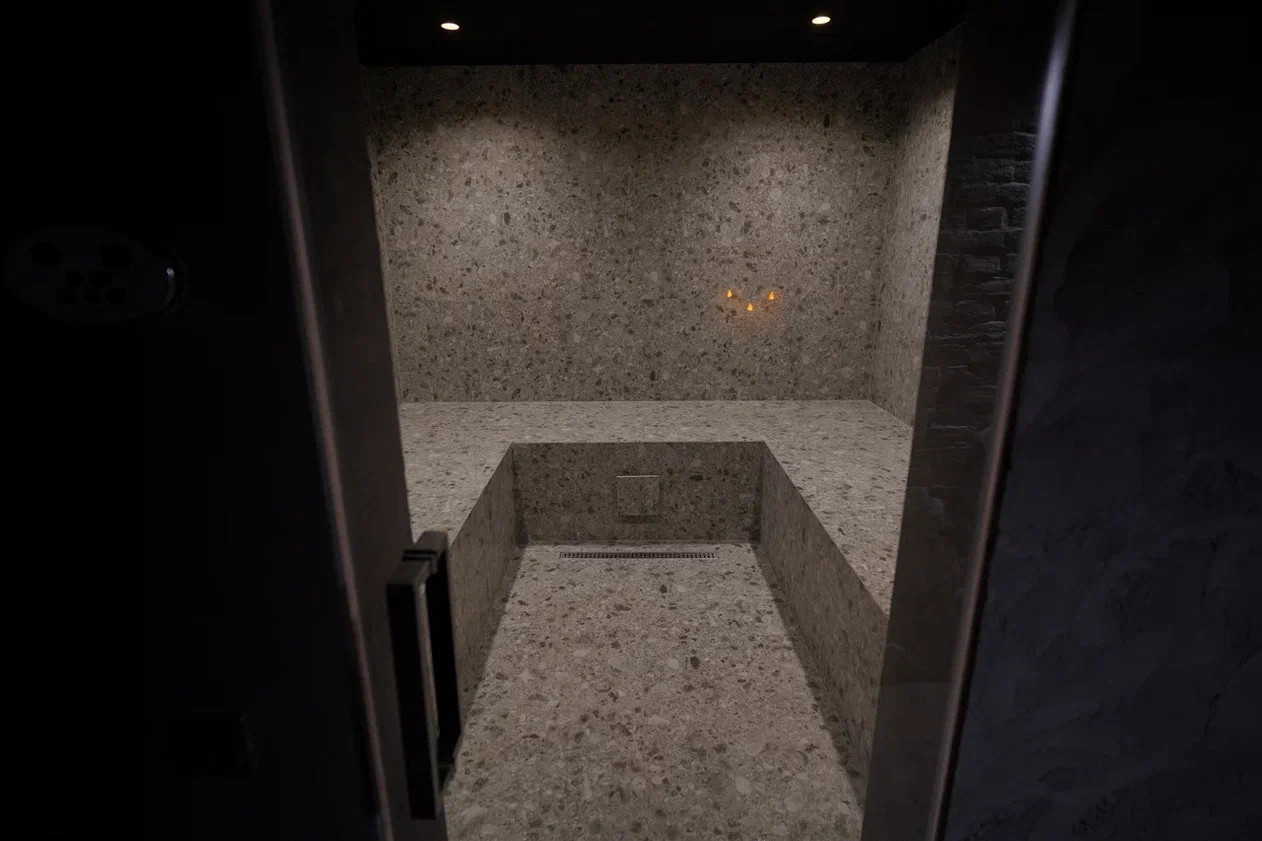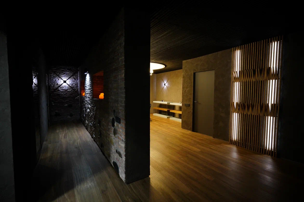 SPA зона - сауна ( установлено оборудование HARVIA, в том числе Звёздное небо), хаммам, душевые с обливным устройством финского производителя SAWO, камерная комната отдыха с биокамином и роскошной Итальянской люстрой, санузел.