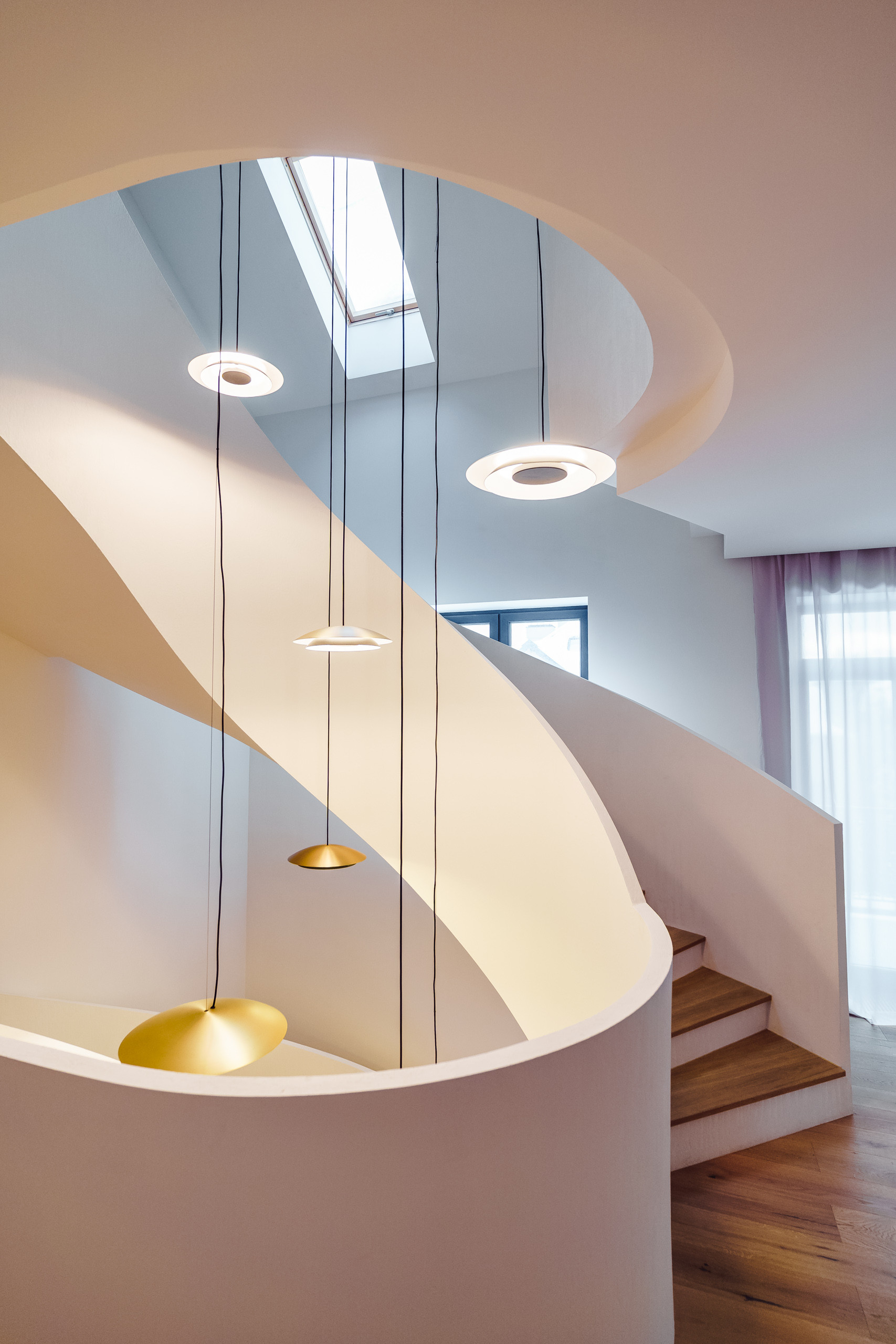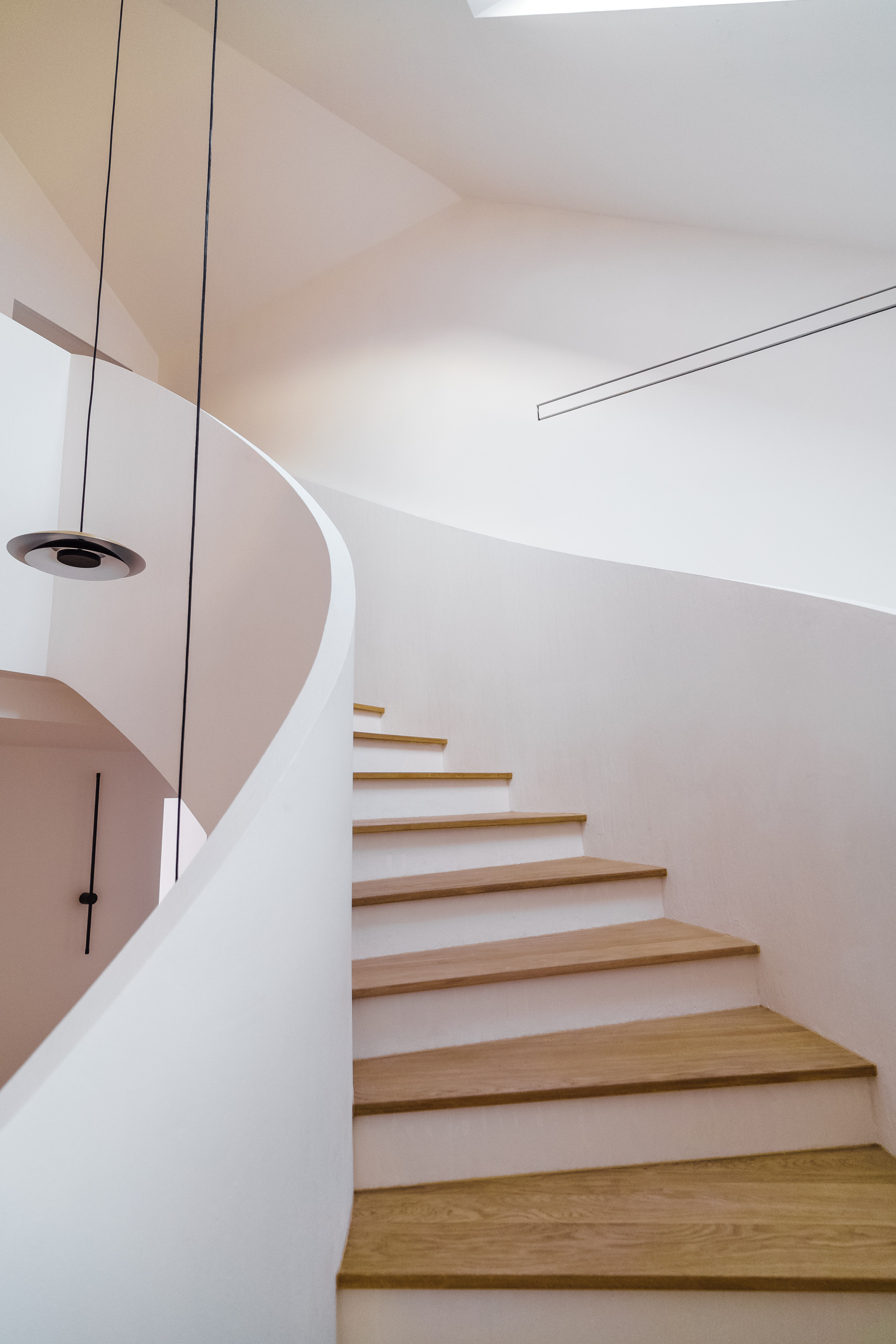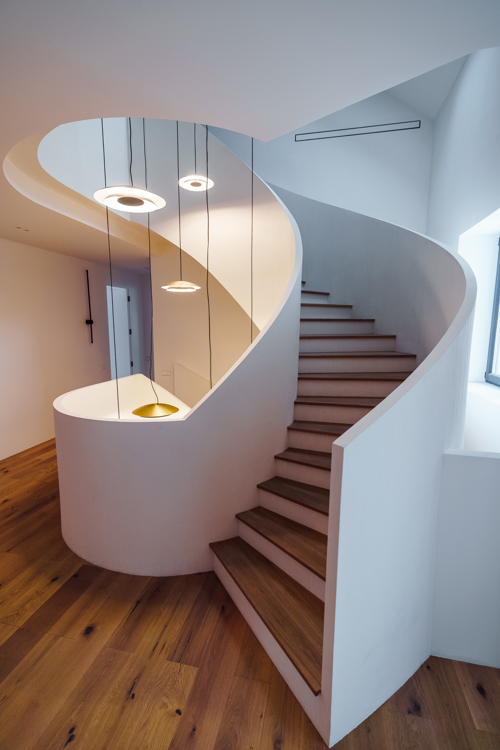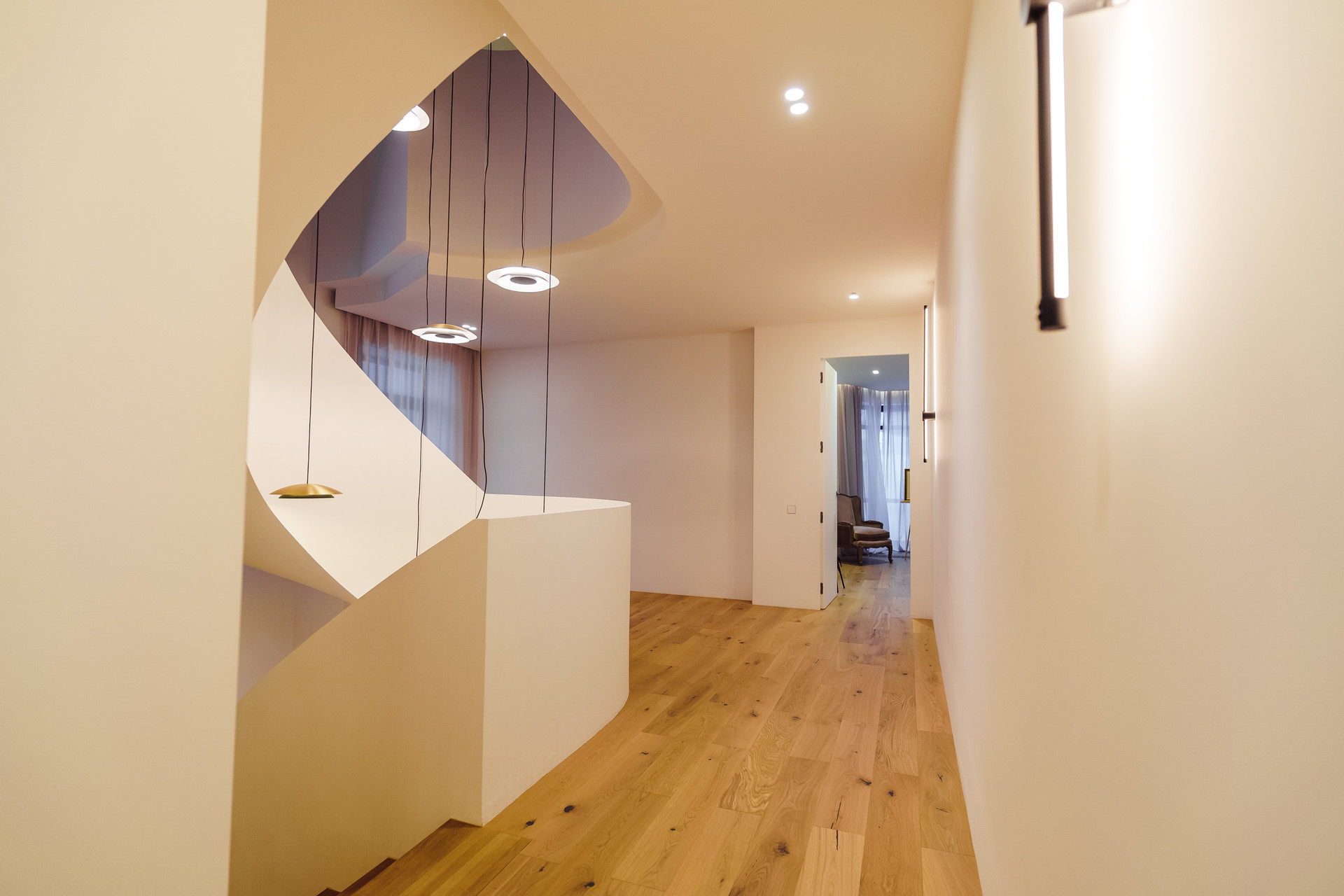 Парящая монолитная лестница с минималистичными светильниками Испанской фабрики LEDs C4 задает необыкновенный стиль всему дому.
