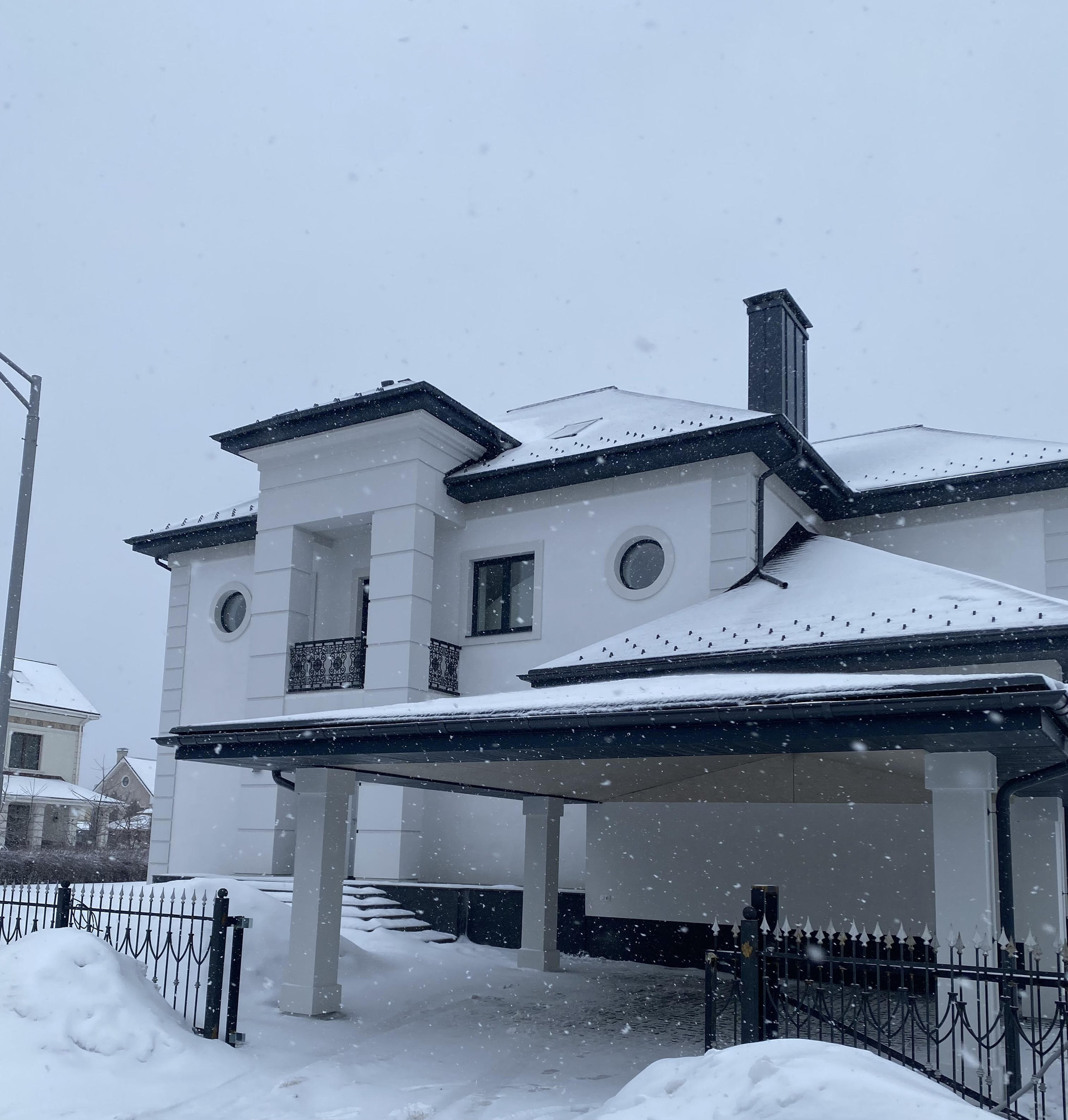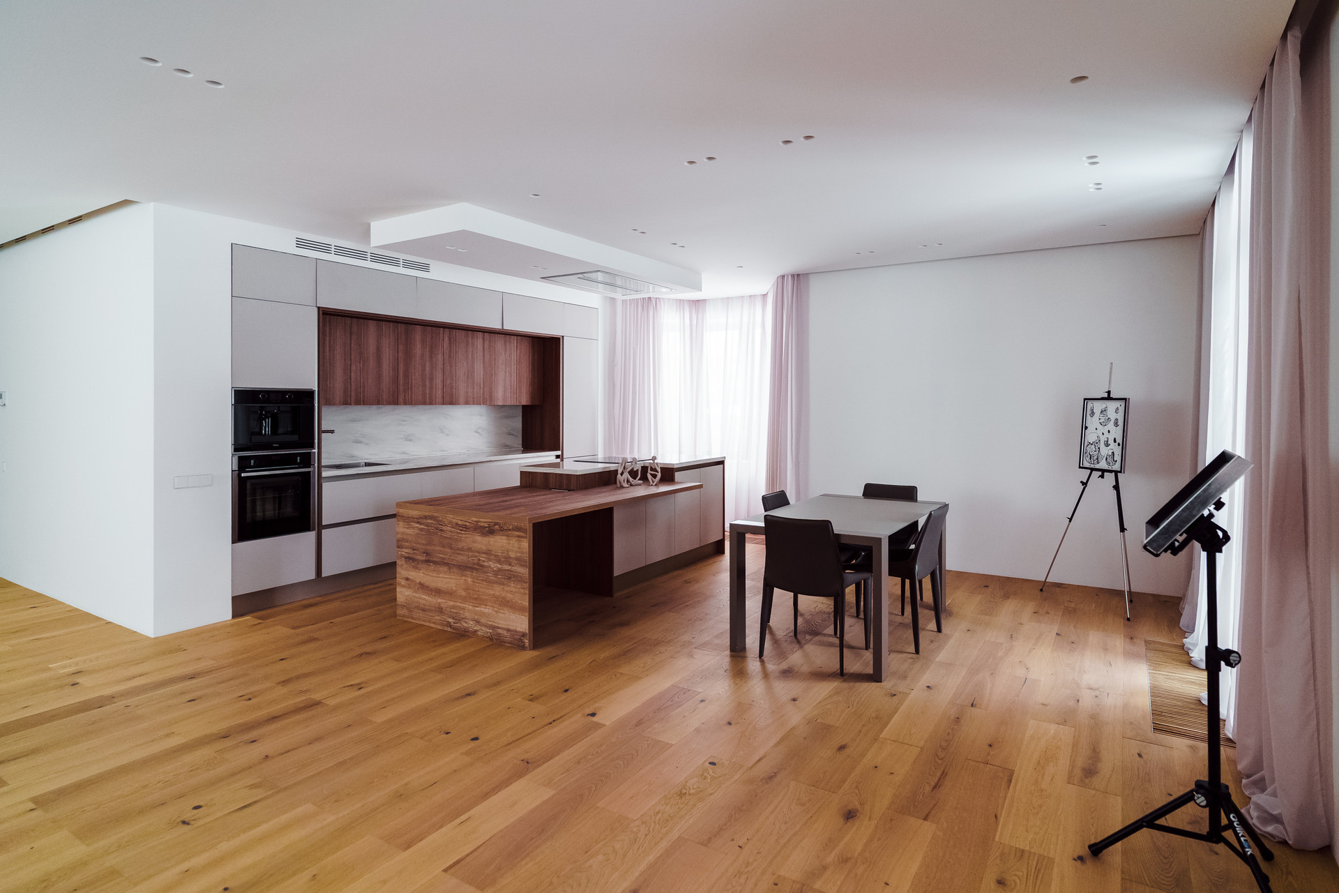 Первый этаж - Просторная зона прихожей, отдельна Гардеробная комната для верхней одежды и дополнительная комната для несезонных вещей, Кухня-гостиная с панорамными окнами, биокамином и выходом на летнюю террасу, современный кухонный гарнитур (со встроенной техникой: посудомоечная машина, холодильник, духовой шкаф, варочная панель и кофе машина. Вся техника немецкого производства). Кухонный остров со встроенной потолочной Итальянской вытяжкой. Гостевая комната с отдельным санузлом, котельная (газовые котлы Buderus);