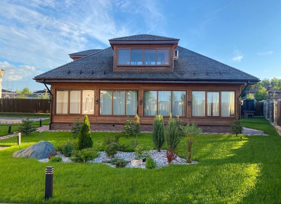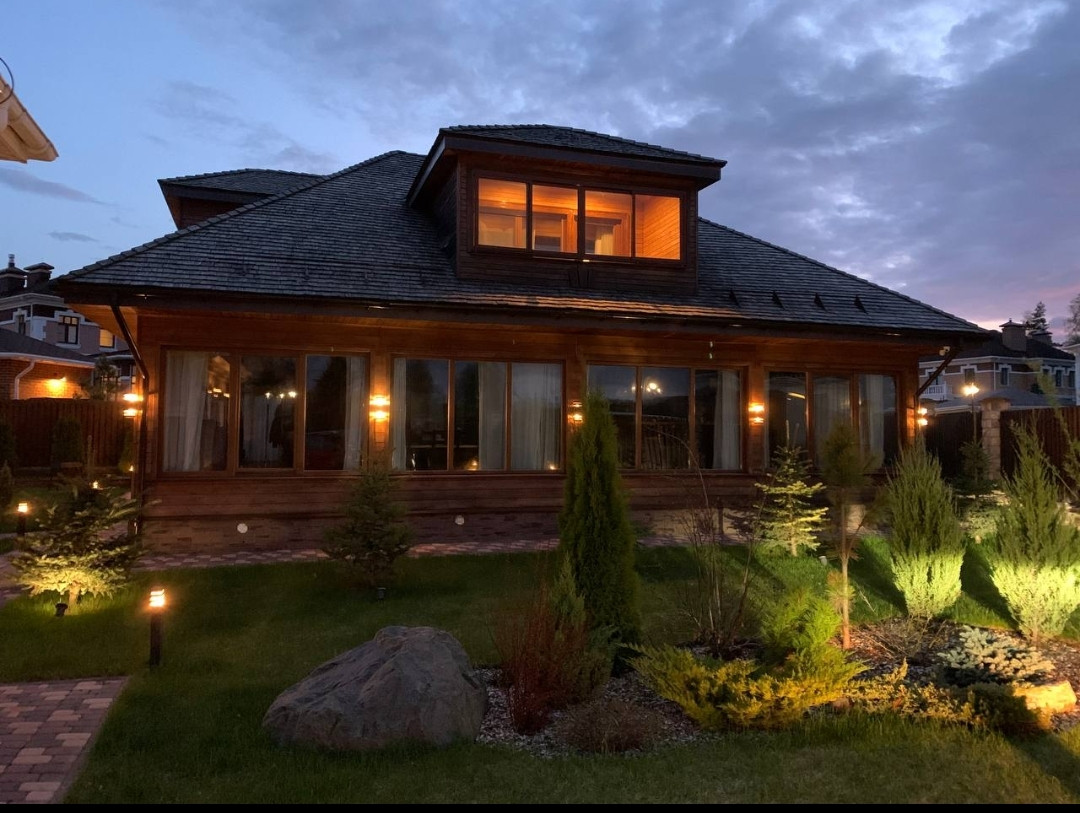 УЧАСТОК :  На участке взрослые хвойные деревья.  Система полива участка и деревьев. Подсветка участка и деревьев. Гараж на два автомобиля. Ливневая канализация. Все дорожки выложены из брусчатки. Есть площадка на два автомобиля.