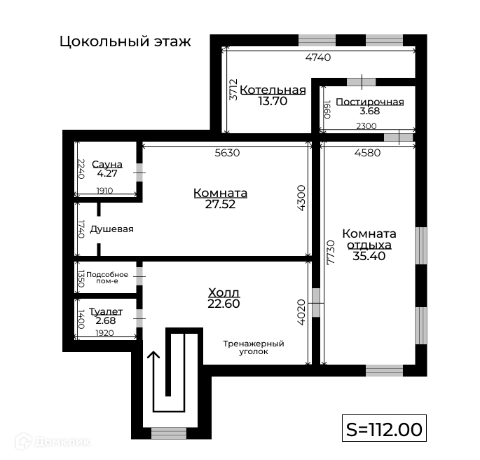 112 м2 Цоколь: сауна, тренажерная, с/у, комната отдыха, котельная, постирочная;