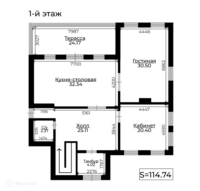 114 м2 1 этаж: кухня-столовая с выходом на террасу, гостиная 30.5 м2, спальня 20.4 м2, туалет;