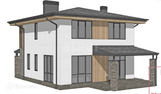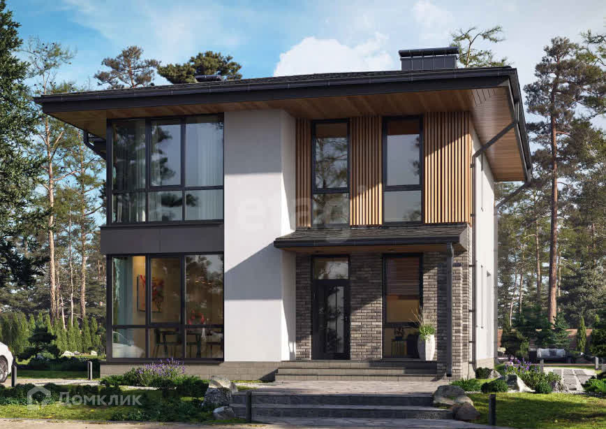 Терраса, панорамное остекление, внешнее освещение на фасаде, мастер-спальня, кухня-гостиная с выходом на террасу, 2 санузла, дровяной камин. Номер в базе: 825004
