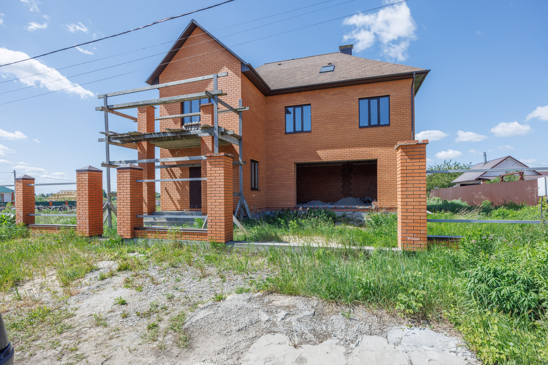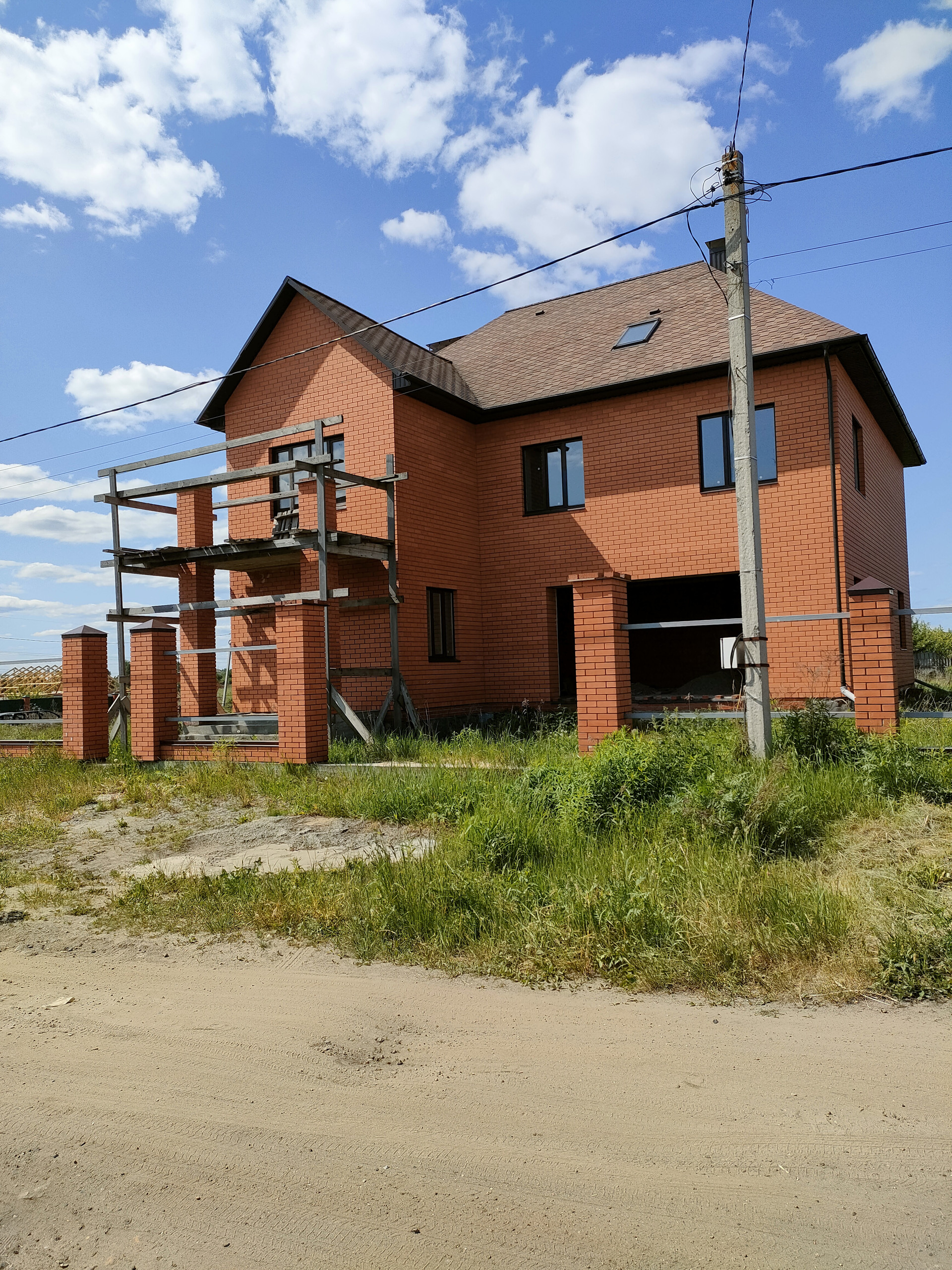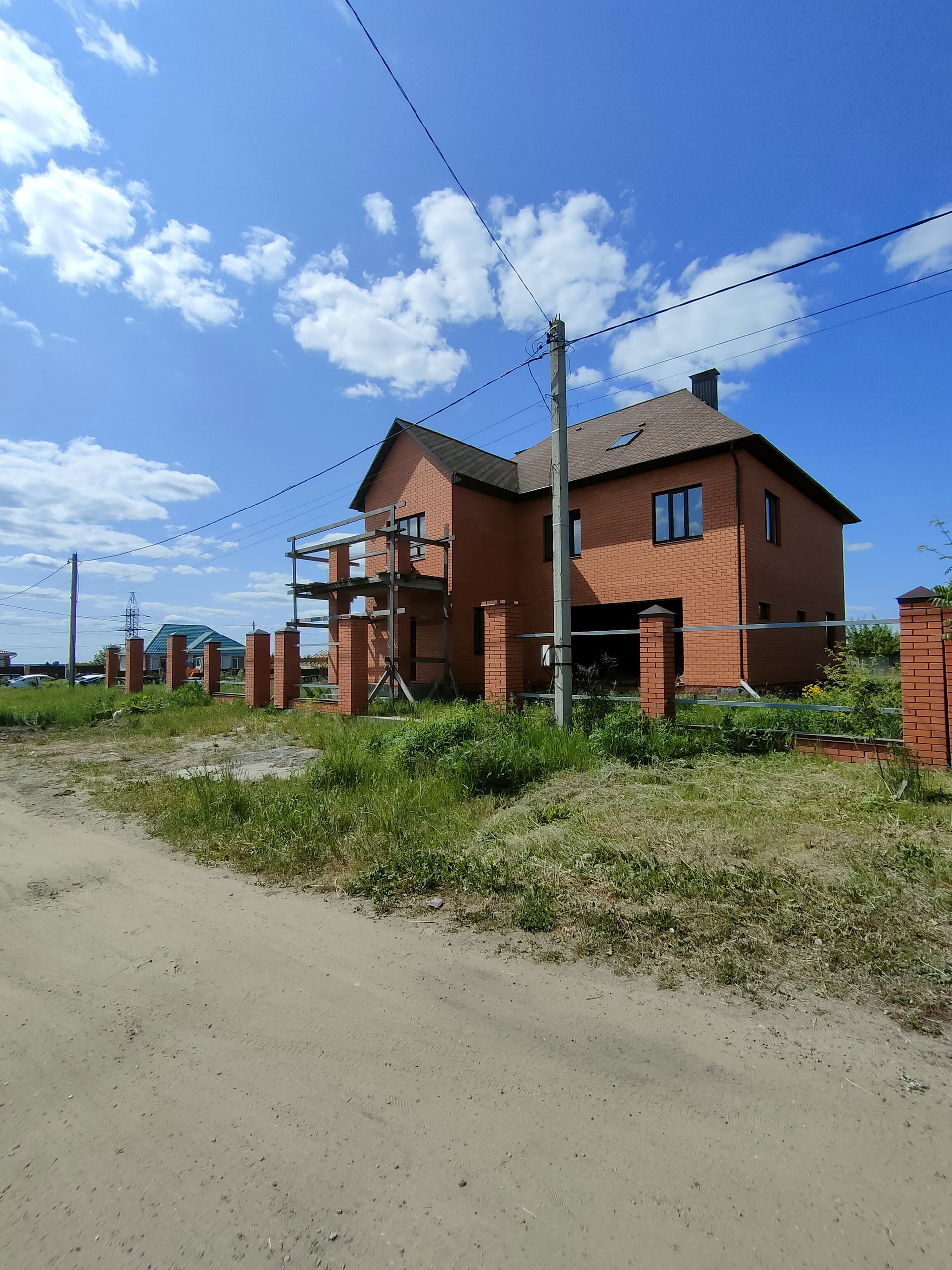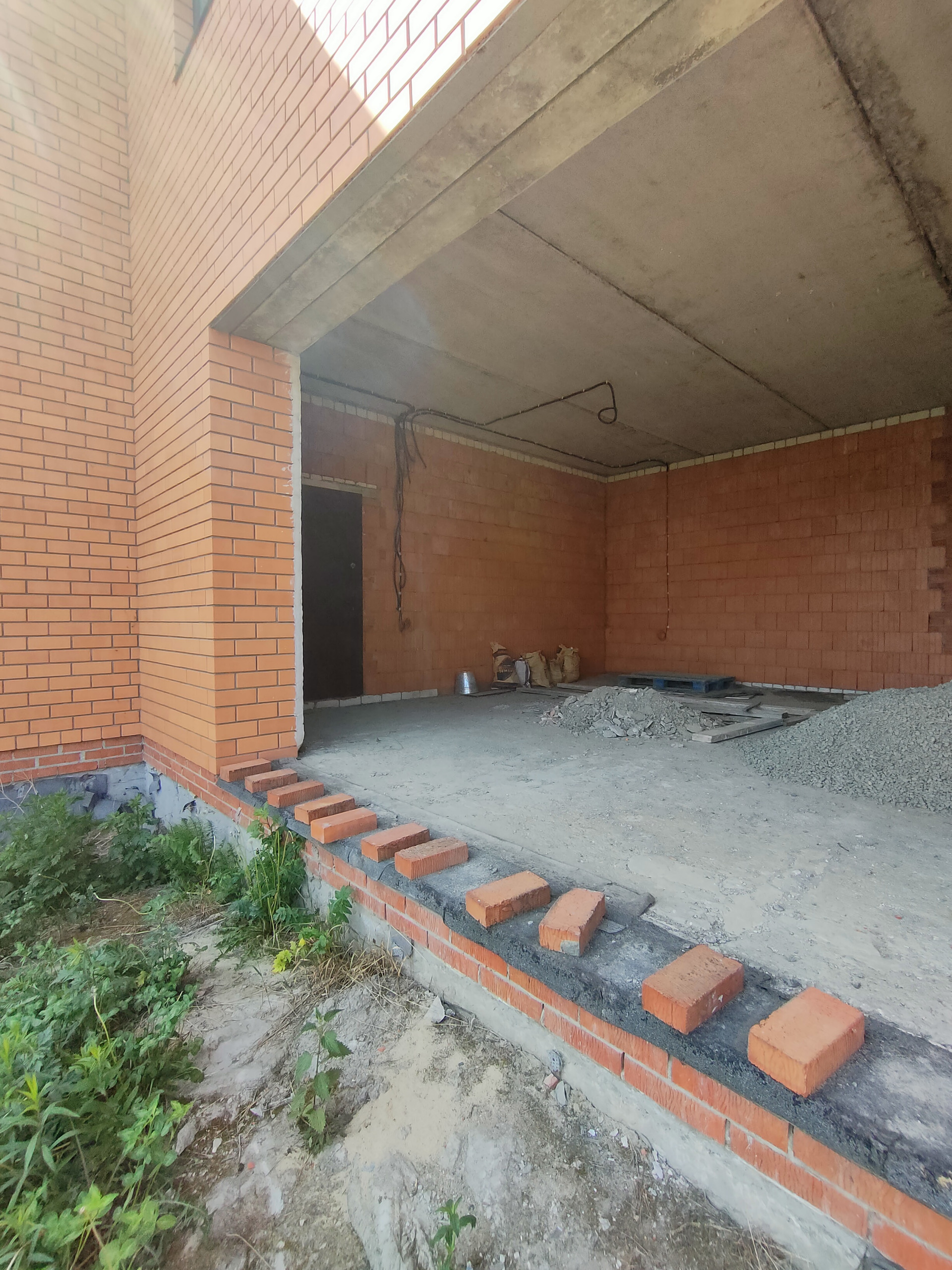 Дом в кирпичном исполнении: стены-керамоблок + красный кирпич, окна ЕВРО, потолок по всему периметру дома около 3.0 м., стены отштукатурены, подведена электрика, подведен газ ✔